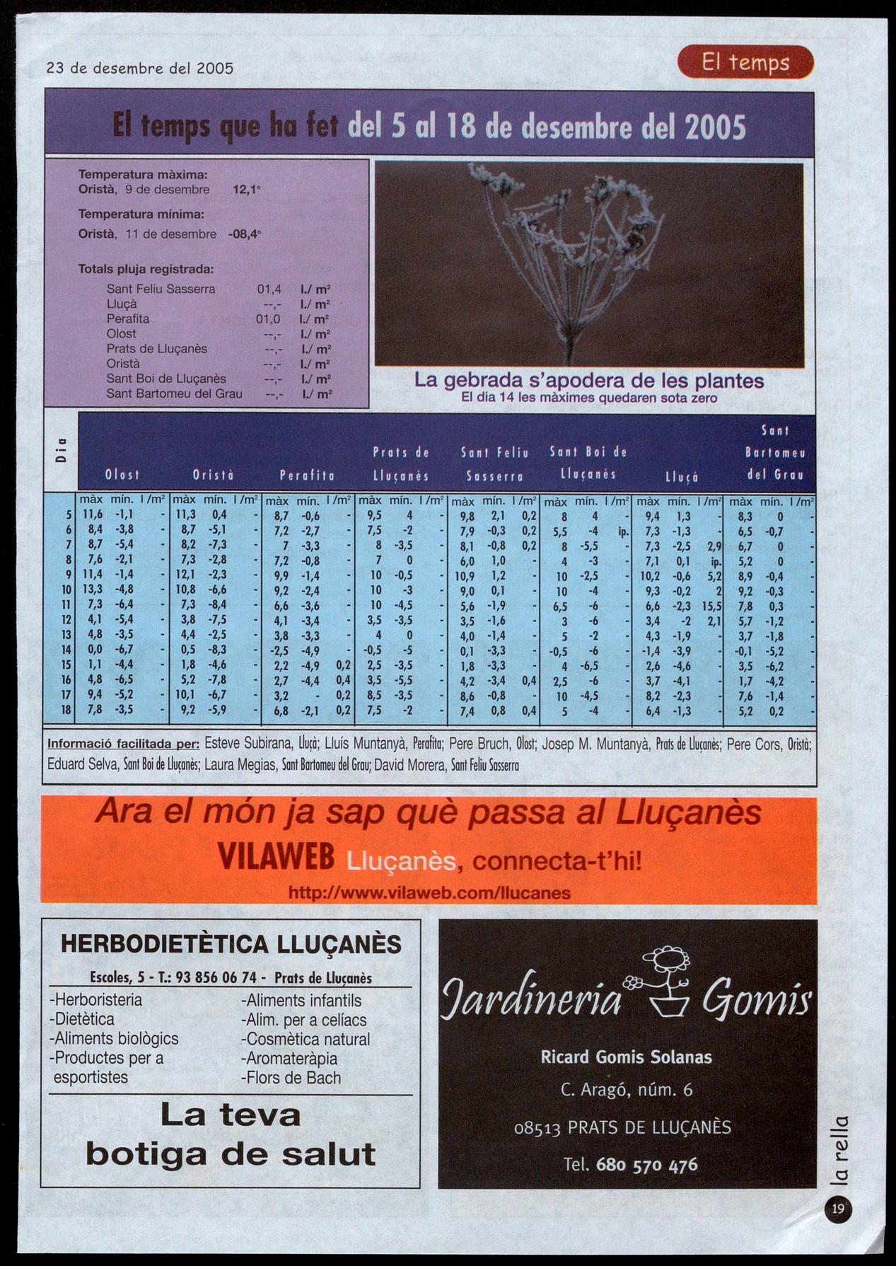 Informació facilitada per: Esteve Subirana, lIu¡à; Lluís Muntanyà, Perafita; Pere Bruch, Olost; Josep M. Muntanyà, Prats de lIu¡onès; Pere Cors, Oristà; Eduard Selva, Sant Boide lIu¡onès; Laura Megias, Sant Bartomeu del Grau; David Morera, Sant �eliu Sasserra