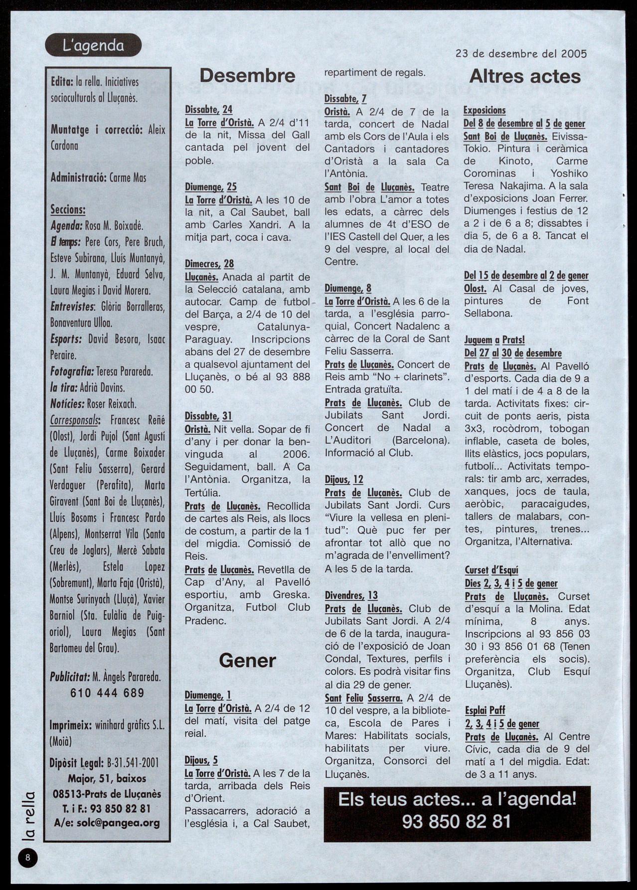 Horari: divendres de 8 a 11 del vespre, a partir del dia 13 de gener de 2006