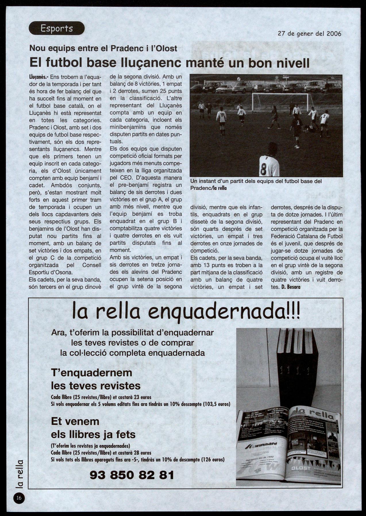 Uu�anès.- Ens trobem a l'equador de la temporada i per tant és hora de fer balanç del que ha succeït fins al moment en el futbol base català, on el Lluçanès hi està representat en totes les categories. Pradenc i Olost, amb set i dos equips de futbol base respectivament, són els dos representants lIuçanencs. Mentre que els primers tenen un equip inscrit en cada categoria, els d'Olost únicament compten amb equip benjamí i cadet. Ambdós conjunts, però, s'estan mostrant molt forts en aquest primer tram de temporada ocupen un dels lIolcs. capdavanters dels seus respectius grups. Els benjamins de l'Olost han disputat nou partits fins al moment, amb un balanç de set victòries i dos empats, en el grup C de la competició organitzada pel Consell Esportiu d'Osona.