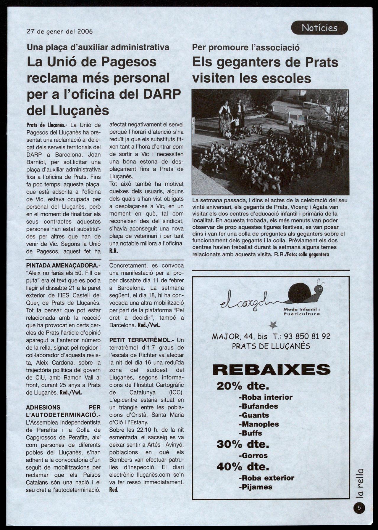 Prats de Llu�anès.- La Unió de Pagesos del Lluçanès ha presentat una reclamació al delegat dels serveis territorials del DARP a Barcelona, Joan Barniol, per sol.licitar una plaça d'auxiliar administrativa fixa a l'oficina de Prats. Fins fa poc temps, aquesta plaça, que està adscrita a l'oficina de Vic, estava ocupada per personal del Lluçanès, però en el moment de finalitzar els seus contractes aquestes persones han estat substituïdes per altres que han de venir de Vic. Segons la Unió de Pagesos, aquest fet ha