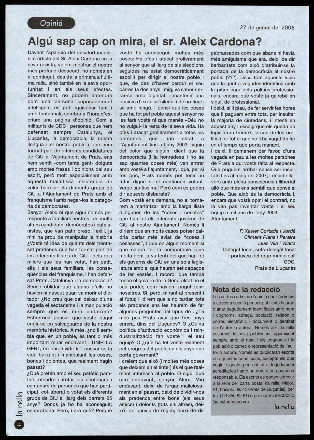 PINTADA AMENAÇADORA."Aleix no faràs els 50. Fill de puta" era el text que es podia llegir el dissabte 21 a la paret exterior de l'lES Castell del Quer, de Prats de Lluçanès. Tot fa pensar que pot estar relacionada amb la reacció que ha provocat en certs cercles de Prats l'article d'opinió aparegut a l'anterior número de la rella, signat pel regidor i col-laborador d'aquesta revista, Aleix Cardona, sobre la trajectòria pollítica del govern de CiU, amb Ramon Vall al front, durant 25 anys a Prats de Lluçanès. Red./VwL.
