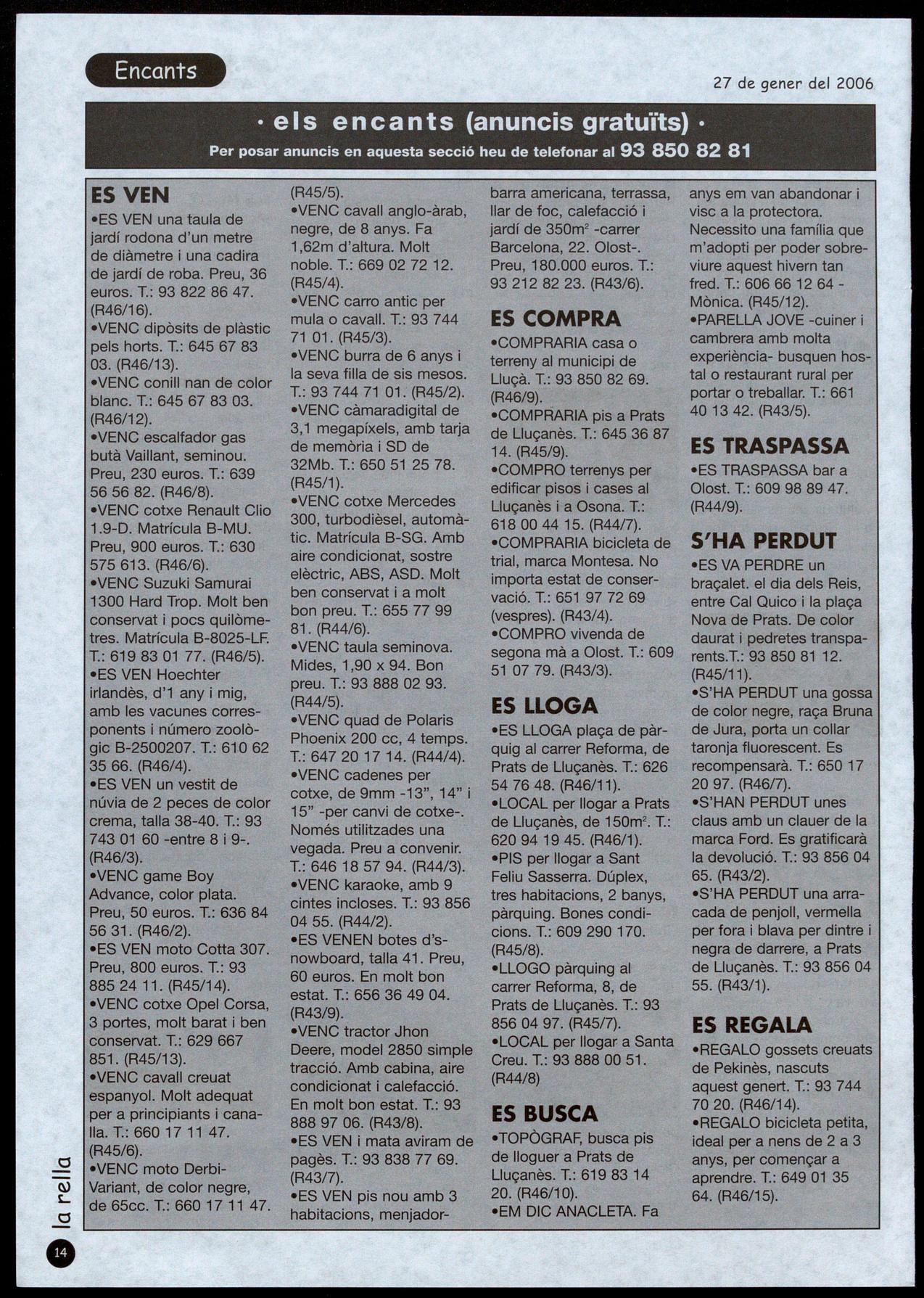 -ES LLOGA plaça de pàr- de Jura, porta un collar gic B-2500207. T.: 610 62 Phoenix 200 cc, 4 temps. quig al carrer Reforma, de taronja fluorescent. Es 35 66. (R46/4). T.: 647 20 17 14. (R44/4). Prats de Lluçanès. T.: 626 recompensarà. T.: 650 17 -VENC cadenes per -ES VEN un vestit de cotxe, de 9mm -13",14" 54 76 48. (R46/11). 20 97. (R46/7). núvia de 2 peces de color 15" -per canvi de cotxe-. -LOCAL per llogar a Prats -S'HAN PERDUT unes crema, talla 38-40. T.: 93 Només utilitzades una de Lluçanès, de 150m2• T.: claus amb un clauer de la 74301 60 -entre 8 i 9-. vegada. Preu a convenir. 620941945. (R46/1). marca Ford. Es gratificarà (R46/3). -PIS per llogar a Sant la devolució. T.: 93 856 04 -VENC game Boy T.: 646 18 57 94. (R44/3). Feliu Sasserra. Dúplex, 65. (R43/2). -VENC karaoke, amb 9 Advance, color plata. cintes incloses. T.: 93 856 tres habitacions, 2 banys, -S'HA PERDUT una arraPreu, 50 euros. T.: 63684 04 55. (R44/2). pàrquing. Bones condi- cada de penjoll, vermella 5631. (R46/2). -ES VENEN botes d'scions. T.: 609 290 170. per fora blava per dintre -ES VEN moto Cotta 307. nowboard, talla 41. Preu, (R45/8). negra de darrere, a Prats Preu, 800 euros. T.: 93 60 euros. En molt bon -LLOGO pàrquing al de Lluçanès. T.: 93 856 04 885 24 11. (R45/14). estat. T.: 656 36 49 04. carrer Reforma, 8, de 55. (R43/1). -VENC cotxe Opel Corsa, (R43/9)._ Prats de Lluçanès. T.: 93 3 portes, moltbarat i ben -VENC tractor Jhon 856 04 97. (R45/7). ES REGALA conservat. T.: 629 667 Deere, model 2850 simple -LOCAL per llogar. a Santa -REGALO gossets creuats 851. (R45/13). tracció. Amb cabina, aire Creu. T.: 93 888 00 51. de Pekinès, nascuts -VENC cavall creuat condicionat calefacció. (R44/8) aquest genert. T.: 93 744 espanyol. Molt adequat En molt bon estat. T.: 93 ES BUSCA 70 20. (R46/14). per a principiants cana888 97 06. (R43/8). -REGALO bicicleta petita, lla. T.: 660 17 11 47. -ES VEN i mata aviram de -TOPÒGRAF, busca pis ideal per a nens de 2 a 3 O (R45/6). pagès. T.: 93 838 77 69. de lloguer a Prats de anys, per començar a -VENC moto Derbi(R43/7). Lluçanès. T.: 619 8314 aprendre. T.: 649 01 35