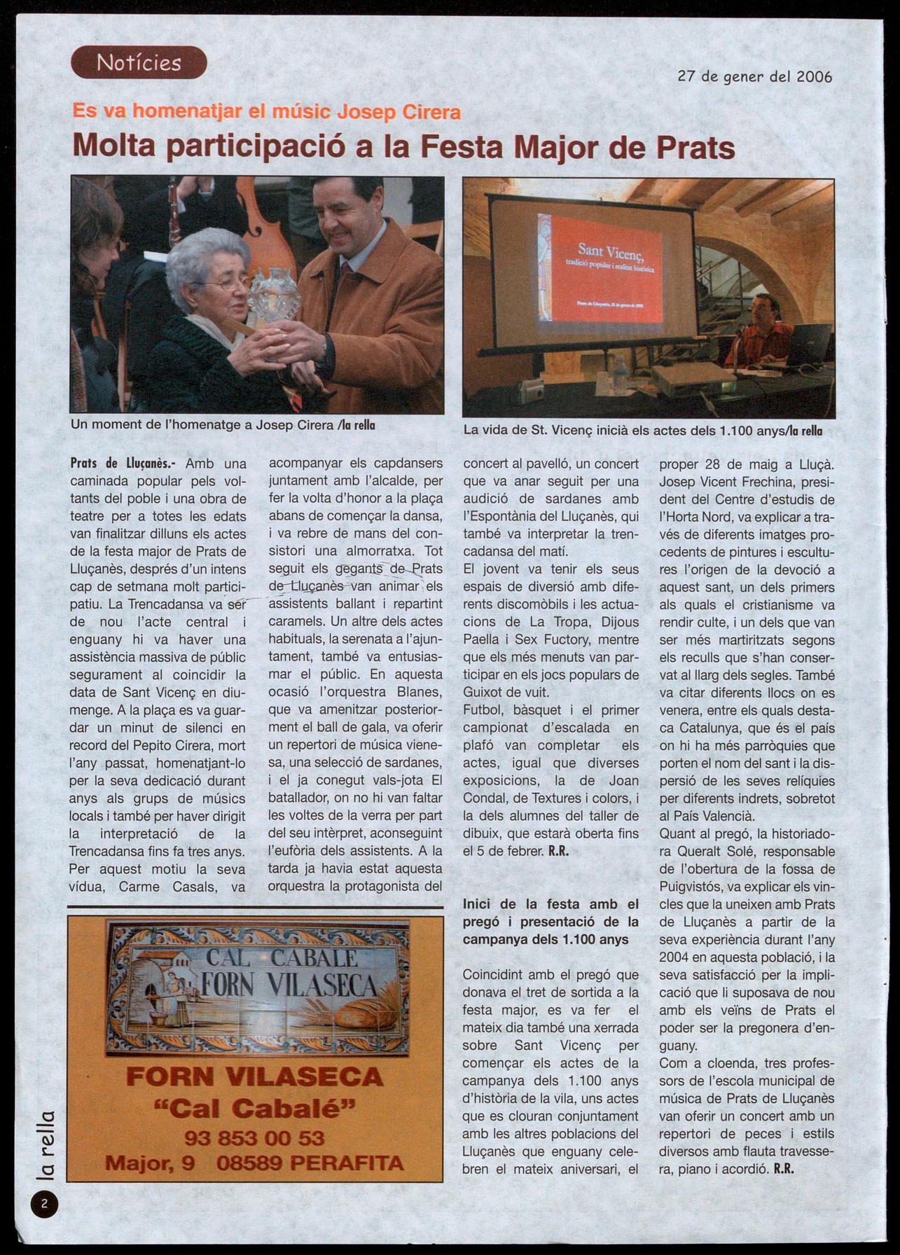 cap de setmana molt partici- d��\laFl animar�els patiu. La Trencadansa va'aéf-- 'assistents ballant i repartint de nou l'acte central i caramels. Un altre dels actes enguany hi va haver una assistència massiva de públic segurament al coincidir la data de Sant Vicenç en diumenge. A la plaça es va guardar un minut de silenci en record del Pepito Cirera, mort l'any passat, homenatjant-lo per la seva dedicació durant anys als grups de músics locals també per haver dirigit la interpretació de la Trencadansa fins fa tres anys. Per aquest motiu la seva vídua, Carme Casals, va