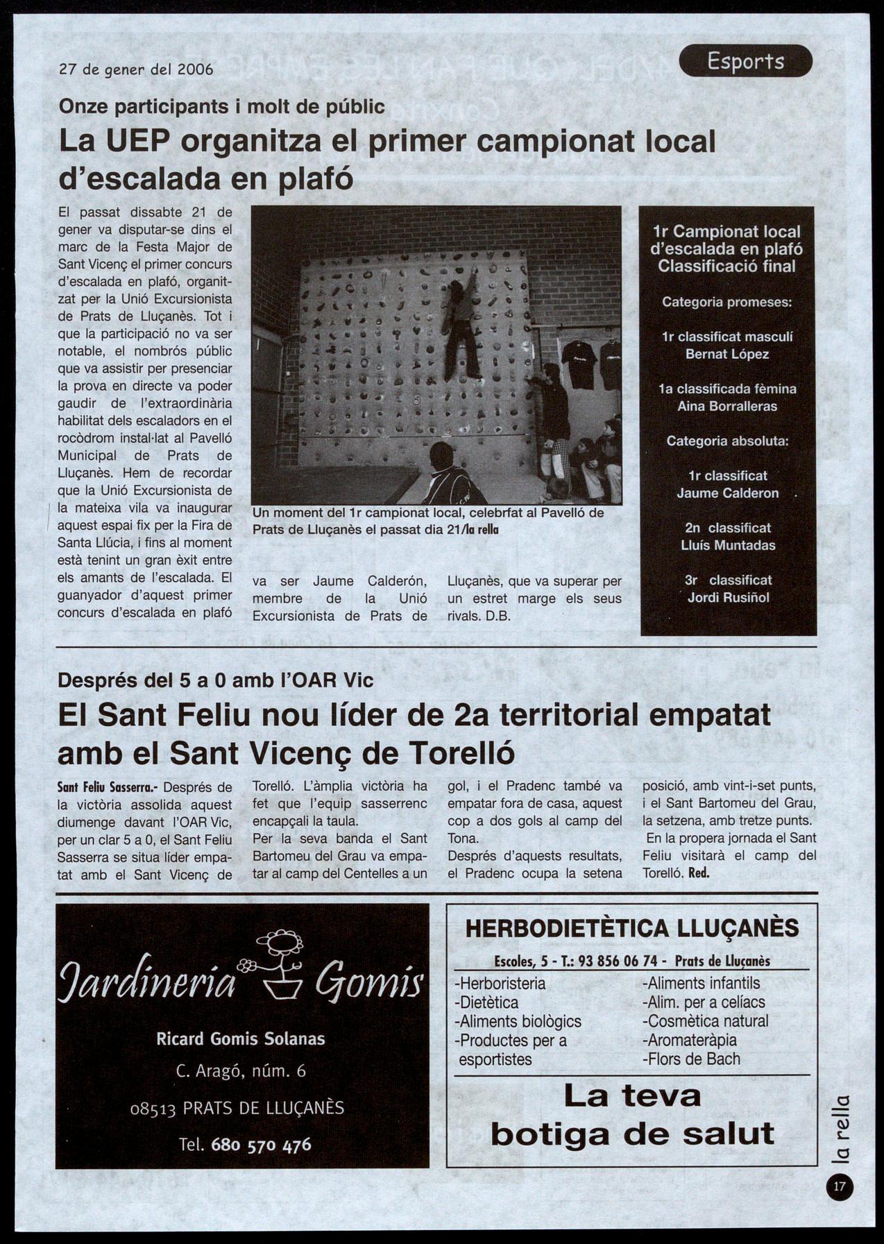 El passat dissabte 21 de gener va disputar-se dins el marc de la Festa Majar de Sant Vicenç el primer concurs d'escalada en plafó, organitzat per la Unió Excursionista de Prats de Lluçanès. Tot i que la participació no va ser notable, el nombrós públic que va assistir per presenciar la prova en directe va poder gaudir de l'extraordinària habilitat dels escaladors en el rocòdrom instat-lat al Pavelló Municipal de Prats de Lluçanès. Hem de recordar que la Unió Excursionista de lla mateixa vila va inaugurar aquest espai fix per la Fira de Santa Llúcia, fins al moment està tenint un gran èxit entre els amants de l'escalada. El guanyador d'aquest primer concurs d'escalada en piafó