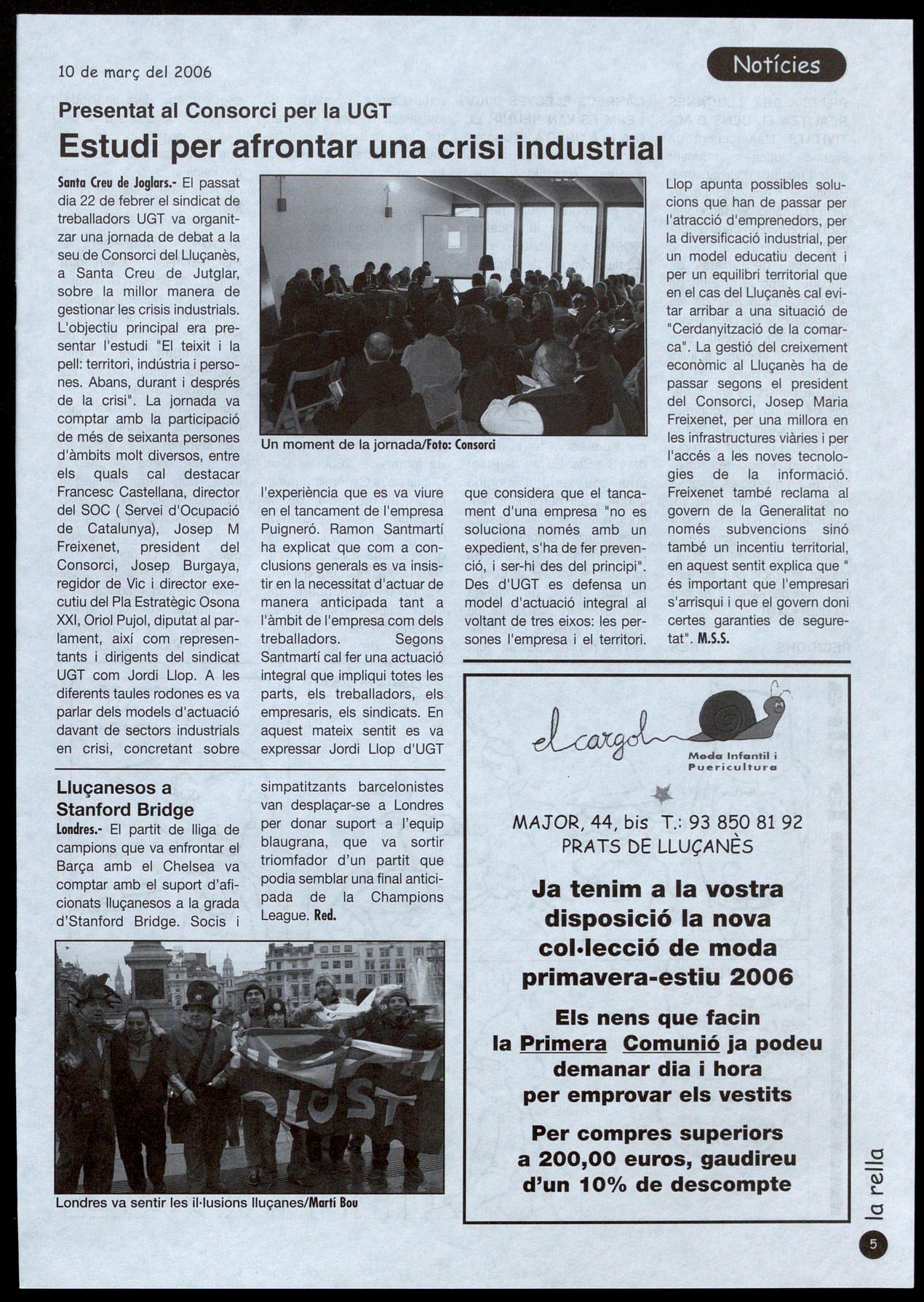 Santa Creu de Joglars.- El passat dia 22 de febrer el sindicat de treballadors UGT va organitzar una jornada de debat a la seu de Consorci del Lluçanès, a Santa Creu de Jutglar, sobre la millor manera de gestionar les crisis industrials. L'objectiu principal era presentar l'estudi "El teixit la pell: territori, indústria persones. Abans, durant i després de la crisi". La jornada va comptar amb la participació de més de seixanta persones d'àmbits molt diversos, entre els quals cal destacar Francesc Castellana, director del SOC ( Servei d'Ocupació de Catalunya), Josep M Freixenet, president del Consorci, Josep Burgaya, regidor de Vic director executiu del Pla Estratègic Osona XXI, Oriol Pujol, diputat al parlament, així com representants dirigents del sindicat UGT com Jordi Llop. A les diferents taules rodones es va parlar dels models d'actuació davant de sectors industrials en crisi, concretant sobre