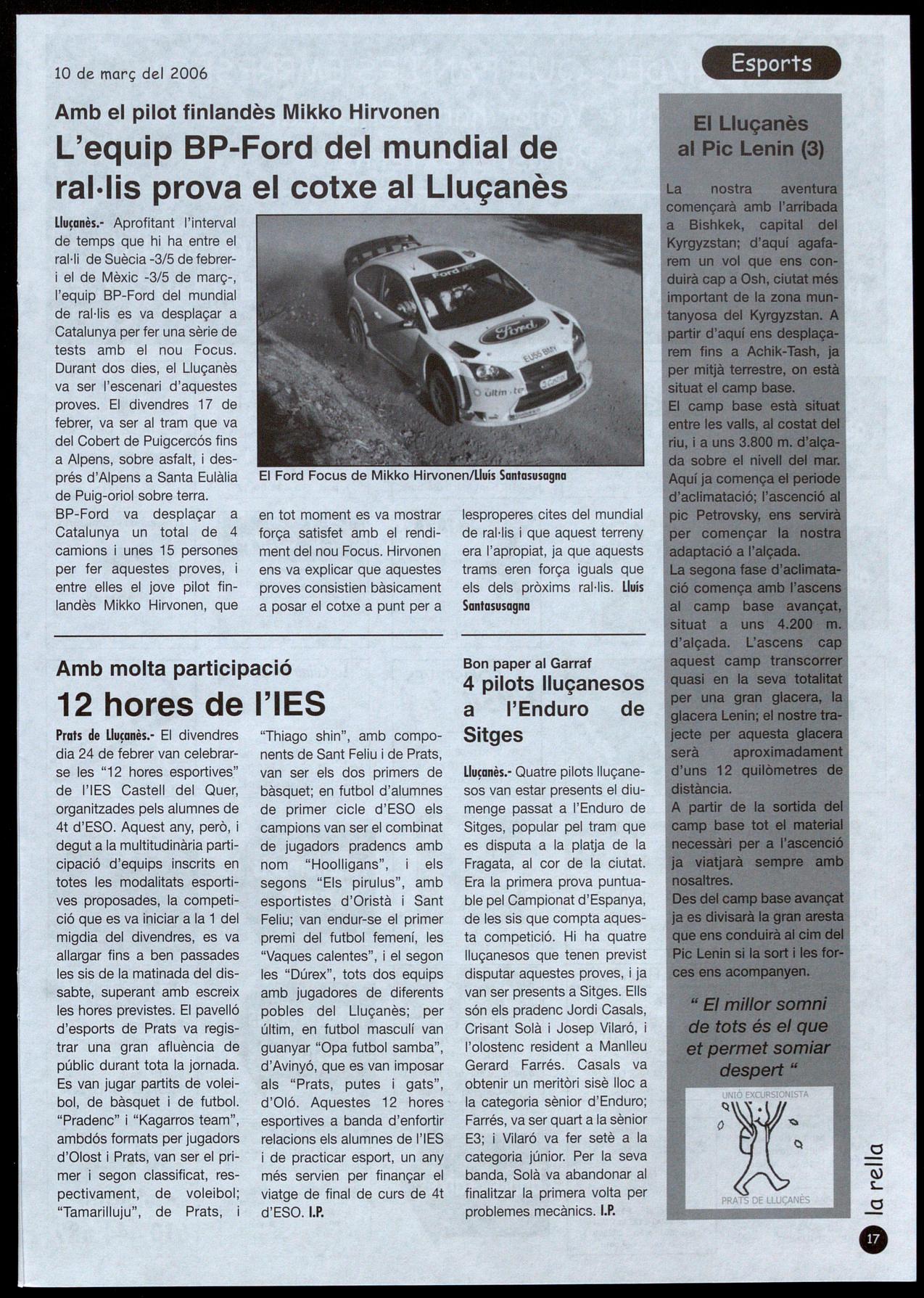 Lluçanès.- Aprofitant l'interval de temps que hi ha entre el ral·li de Suècia -3/5 de febreri el de Mèxic -3/5 de rnarç-, l'equip BP-Ford del mundial de ral·lis es va desplaçar a Catalunya per fer una sèrie de tests amb el nou Focus. Durant dos dies, el Lluçanès va ser l'escenari d'aquestes proves. El divendres 17 de febrer, va ser al tram que va del Cobert de Puigcercós fins a Alpens, sobre asfalt, després d'Alpens a Santa Eulàlia de Puig-oriol sobre terra.