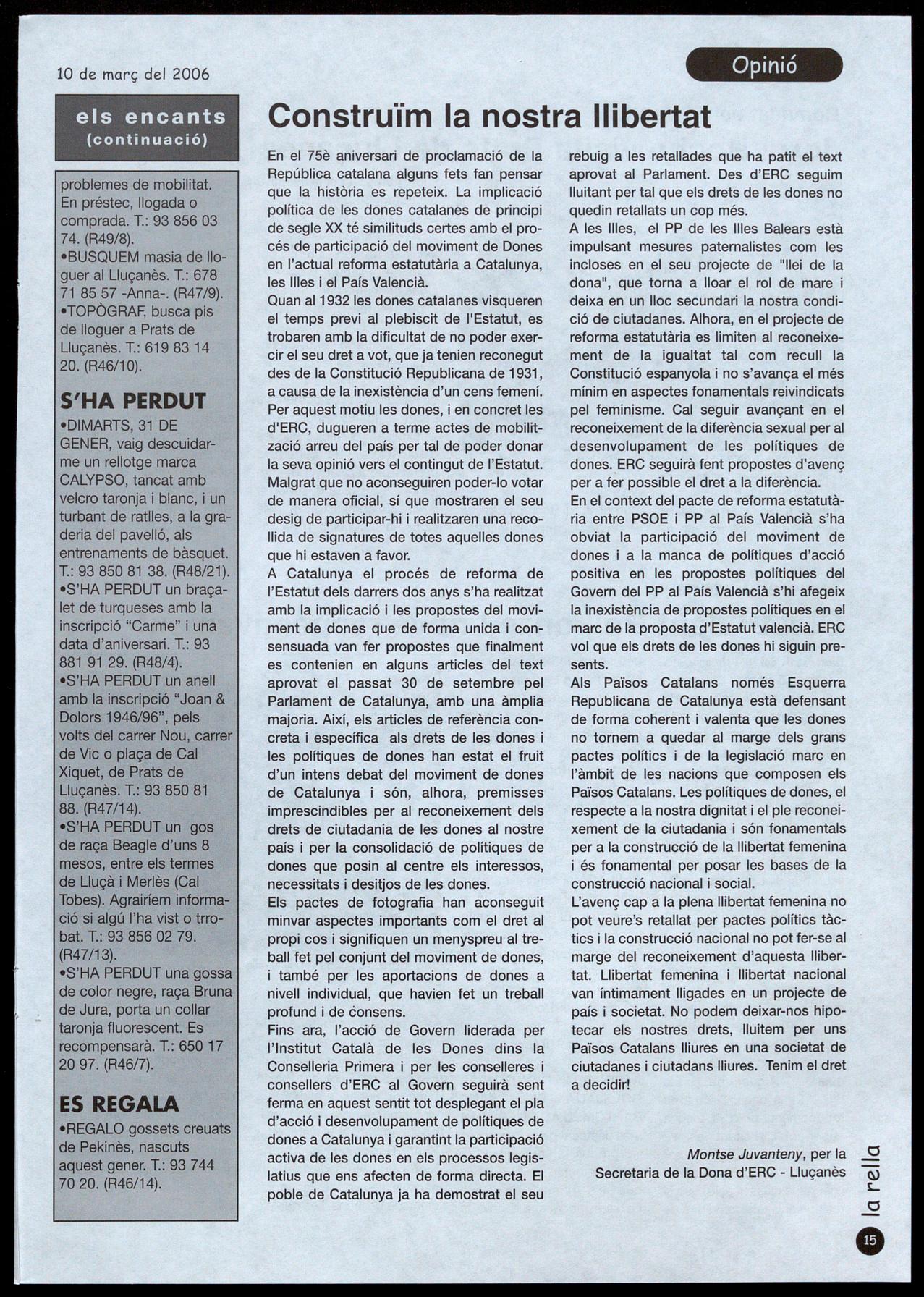 Llu�anès.- La plataforma El Lluçanès és comarca ha fet públic un comunicat a rel de la reunió que van mantenir representants d'aquest organisme popular membres del Comitè Executiu del Consorci del Lluçanès, el dimarts 28 de febrer, a Perafita.