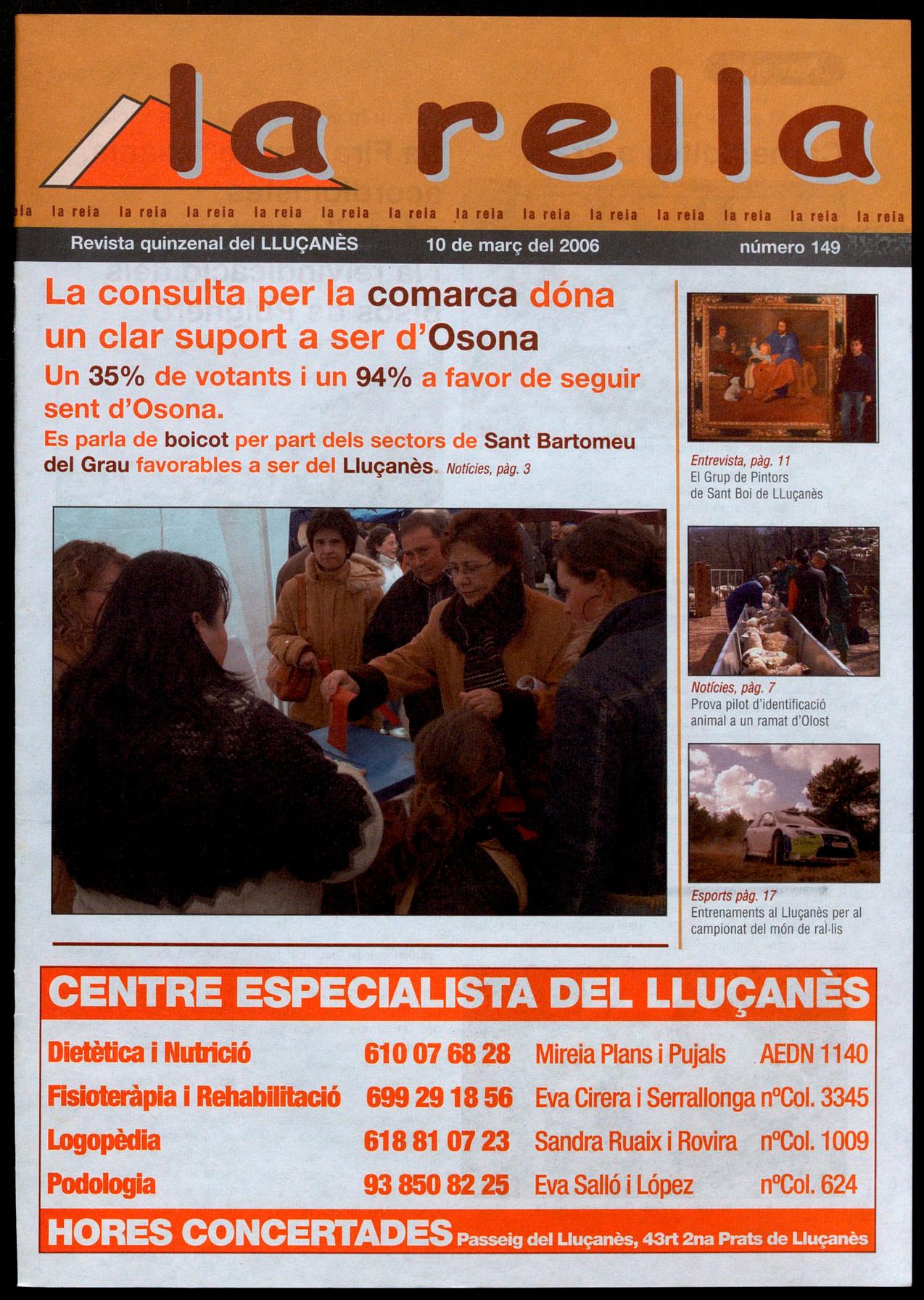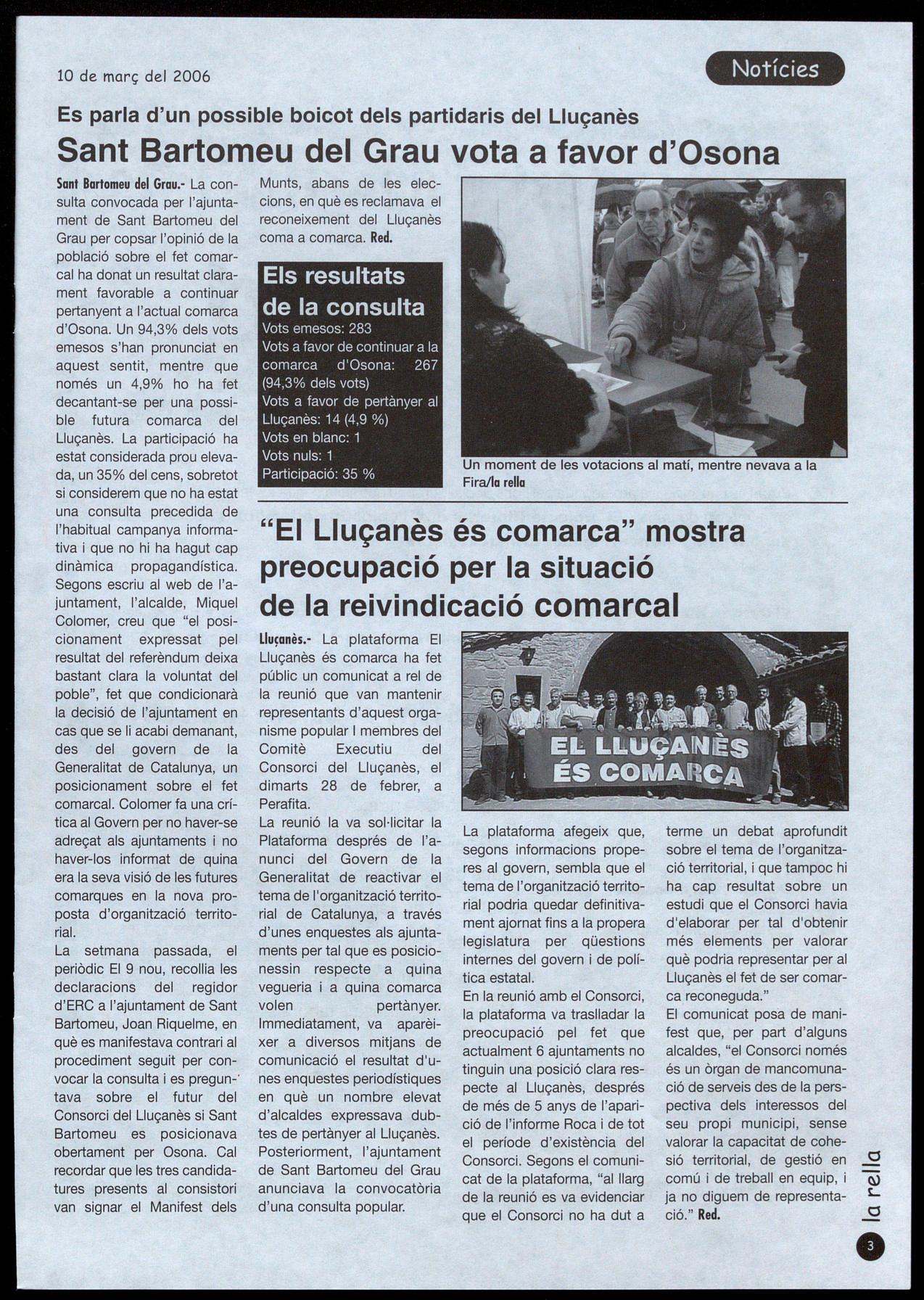 Sant Bartomeu del Grau.- La consulta convocada per l'ajuntament de Sant Bartomeu del Grau per copsar l'opinió de la població sobre el fet comarcal ha donat un resultat clarament favorable a continuar pertanyent a l'actual comarca d'Osona. Un 94,3% dels vots emesos s'han pronunciat en aquest sentit, mentre que només un 4,9% ho ha fet decantant-se per una possible futura comarca del Lluçanès. La participació ha estat considerada prou elevada, un 35% del cens, sobretot si considerem que no ha estat una consulta precedida de l'habitual campanya informativa i que no hi ha hagut cap dinàmica propagandística. Segons escriu al web de l'ajuntament, l'alcalde, Miquel Colomer, creu que "el posicionament expressat pel resultat del referèndum deixa bastant clara la voluntat del poble", fet que condicionarà la decisió de l'ajuntament en cas que se li acabi demanant, des del govern de la Generalitat de Catalunya, un posicionament sobre el fet comarcal. Colomer fa una crítica al Govern per no haver-se adreçat als ajuntaments no haver-los informat de quina era la seva visió de les futures comarques en la nova proposta d'organització territorial.
