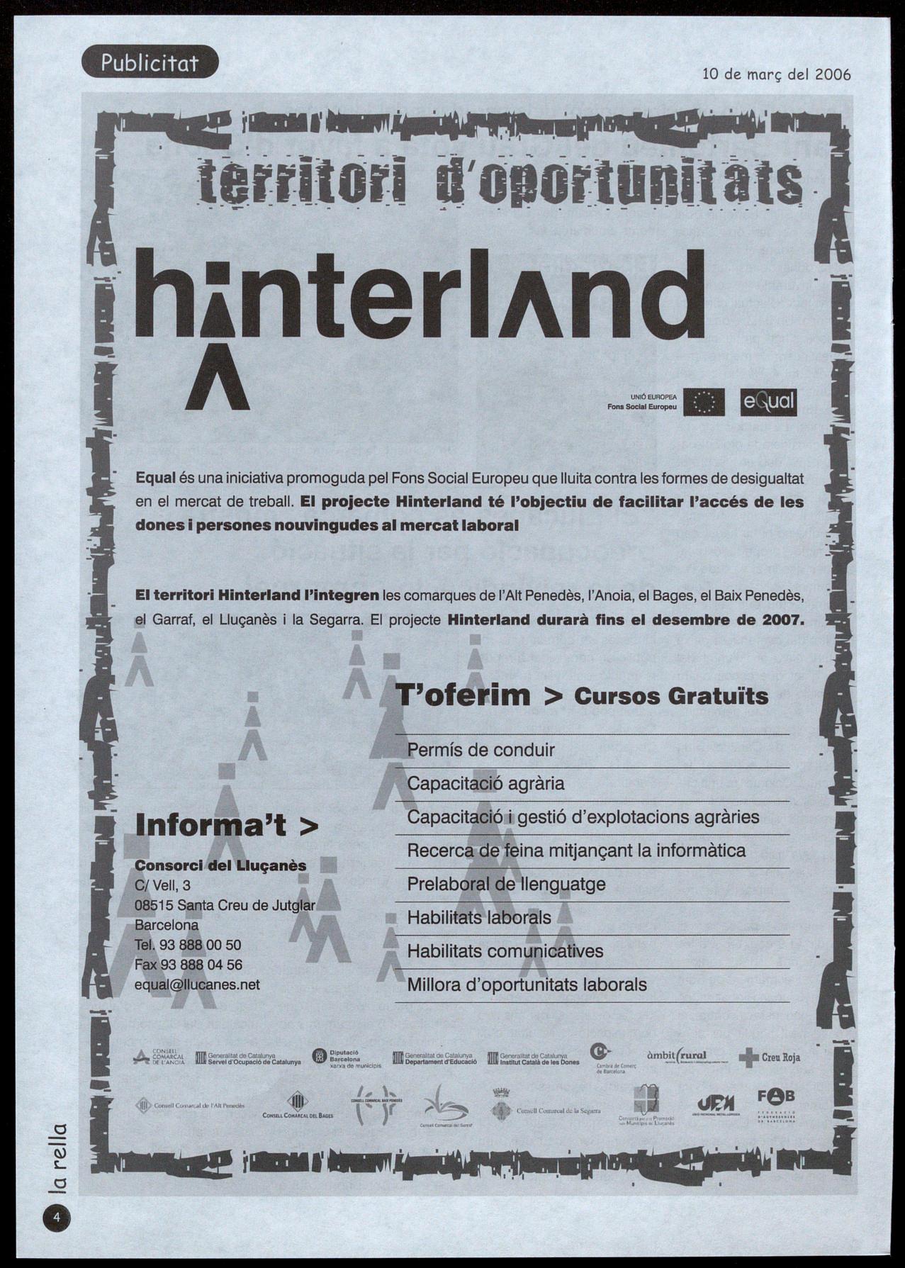 Equal és una iniciativa promoguda pel Fons Social Europeu que lluita contra les formes de desigualtat en el mercat de treball. El projecte Hinterland té l'objectiu de facilitar l'accés de les dones i persones nouvingudes al mercat laboral