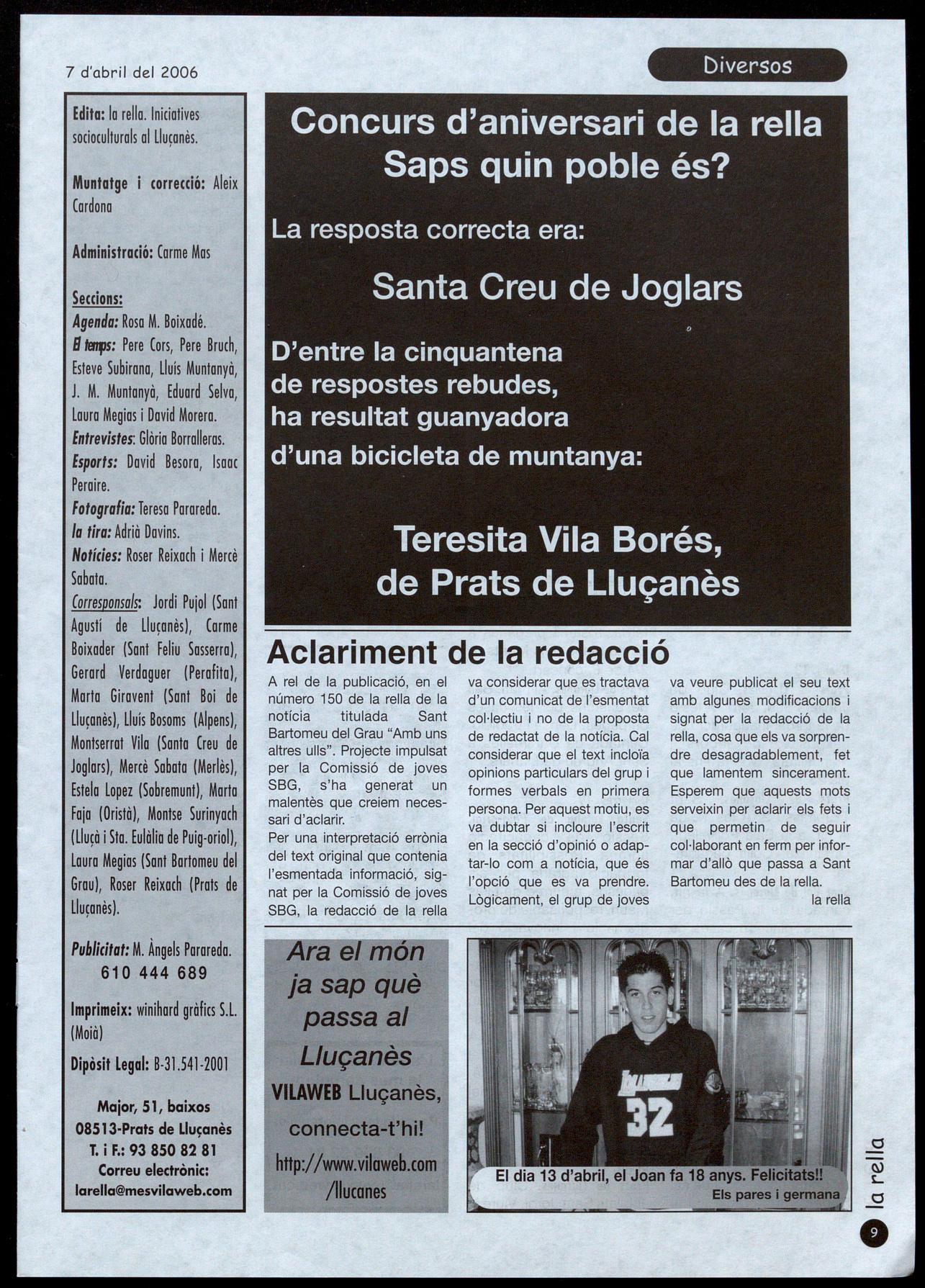 Informació facilitada per: Esteve SuMana, tlu¡à;' Lluís Muntanyà, Perolilô; pere Bruch, Olosl; Josep tv1. Muntanyà, Prols de Llu¡onès; Pere Cors, Orislà; Eduard Selva, SonI Boi de Llu¡onès; Laura. Megias, S.onlBortom,eu del Grou; David MQrera,,�SonlFeliu Sosserro