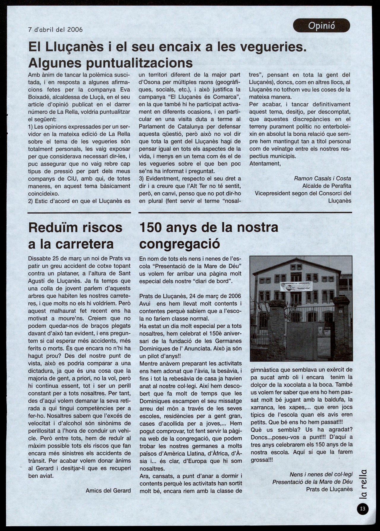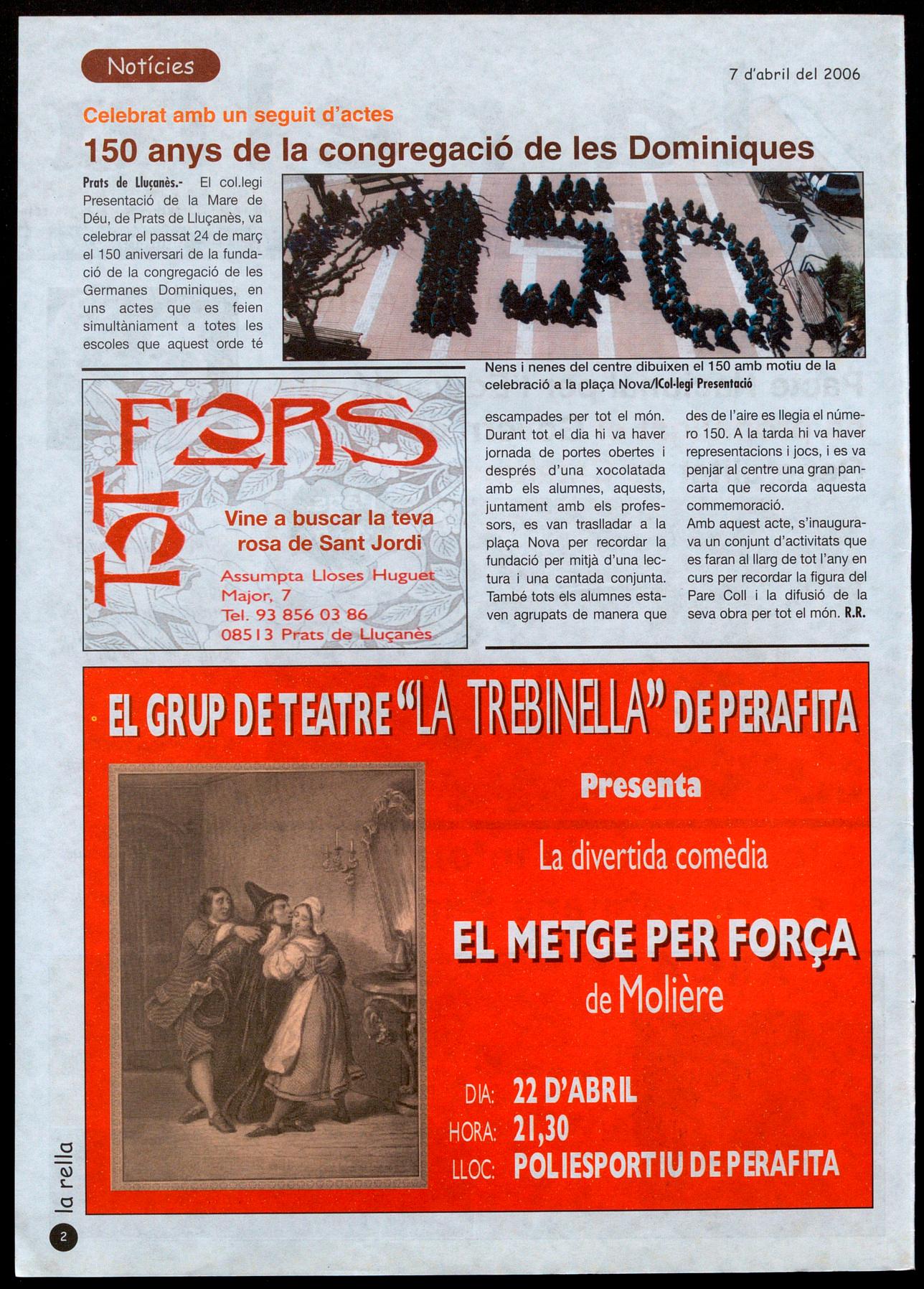 Prats de Lluçanès.- El col.legi Presentació de la Mare de Déu, de Prats de Lluçanès, va celebrar el passat 24 de març el 150 aniversari de la fundació de la congregació de les Germanes Dominiques, en uns actes que es feien simultàniament a totes les escoles que aquest orde té