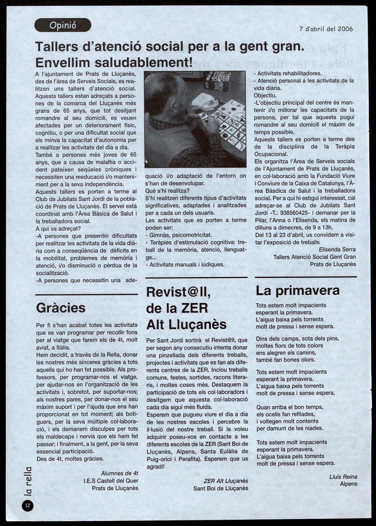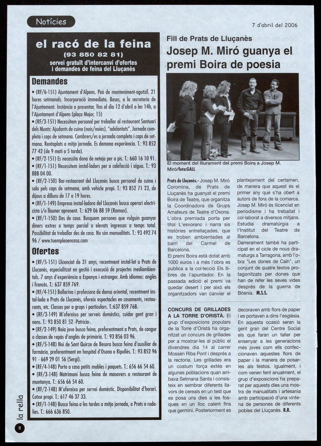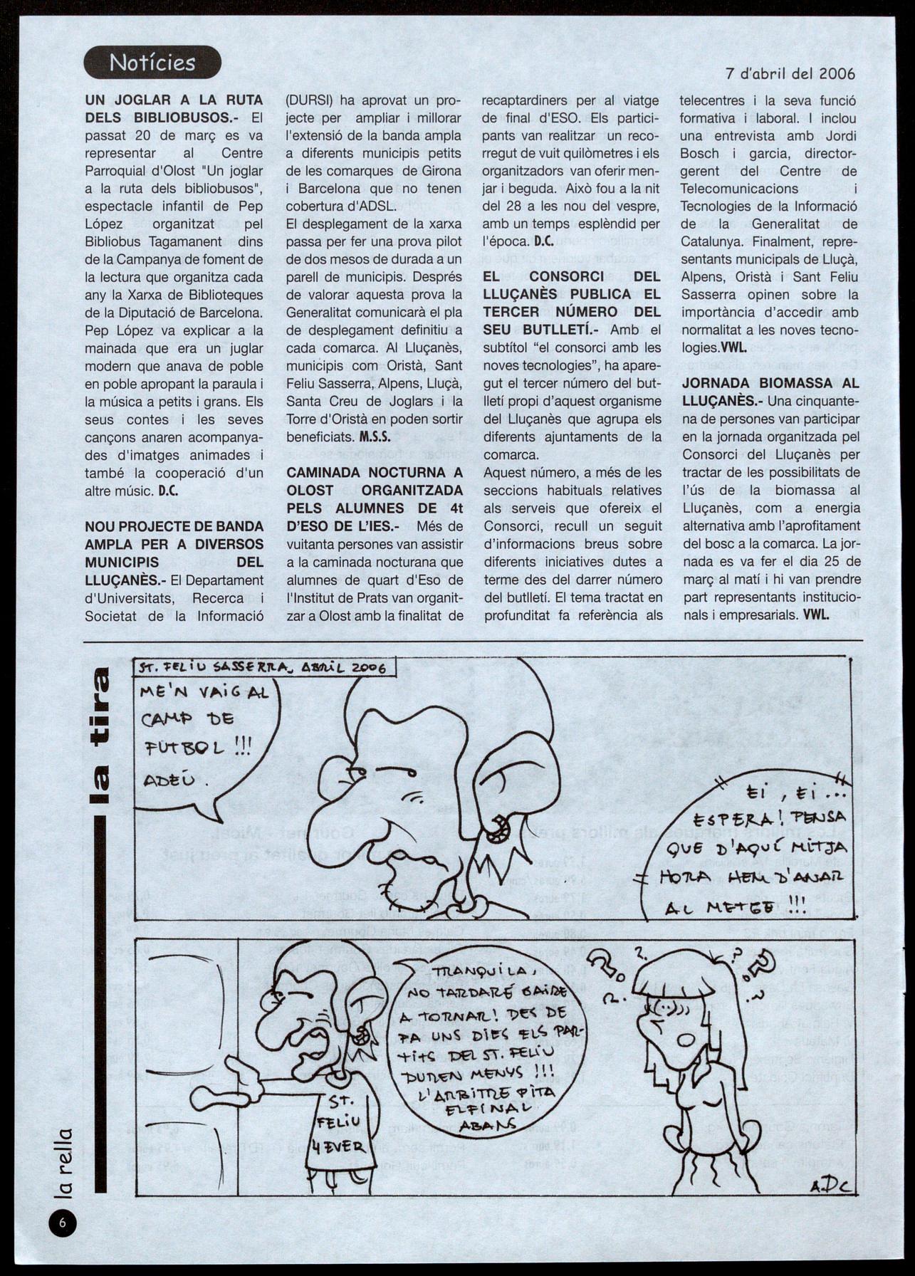 telecentres la seva funció formativa laboral. I inclou una entrevista amb Jordi Bosch garcia, directorgerent del Centre de Telecomunicacions Tecnologies de la Informació de la Generalitat de Catalunya. Finalment, representants municipals de Lluçà, Alpens, Oristà i Sant Feliu Sasserra opinen sobre la importància d'accedir amb normalitat a les noves tecno10gies.VWL.