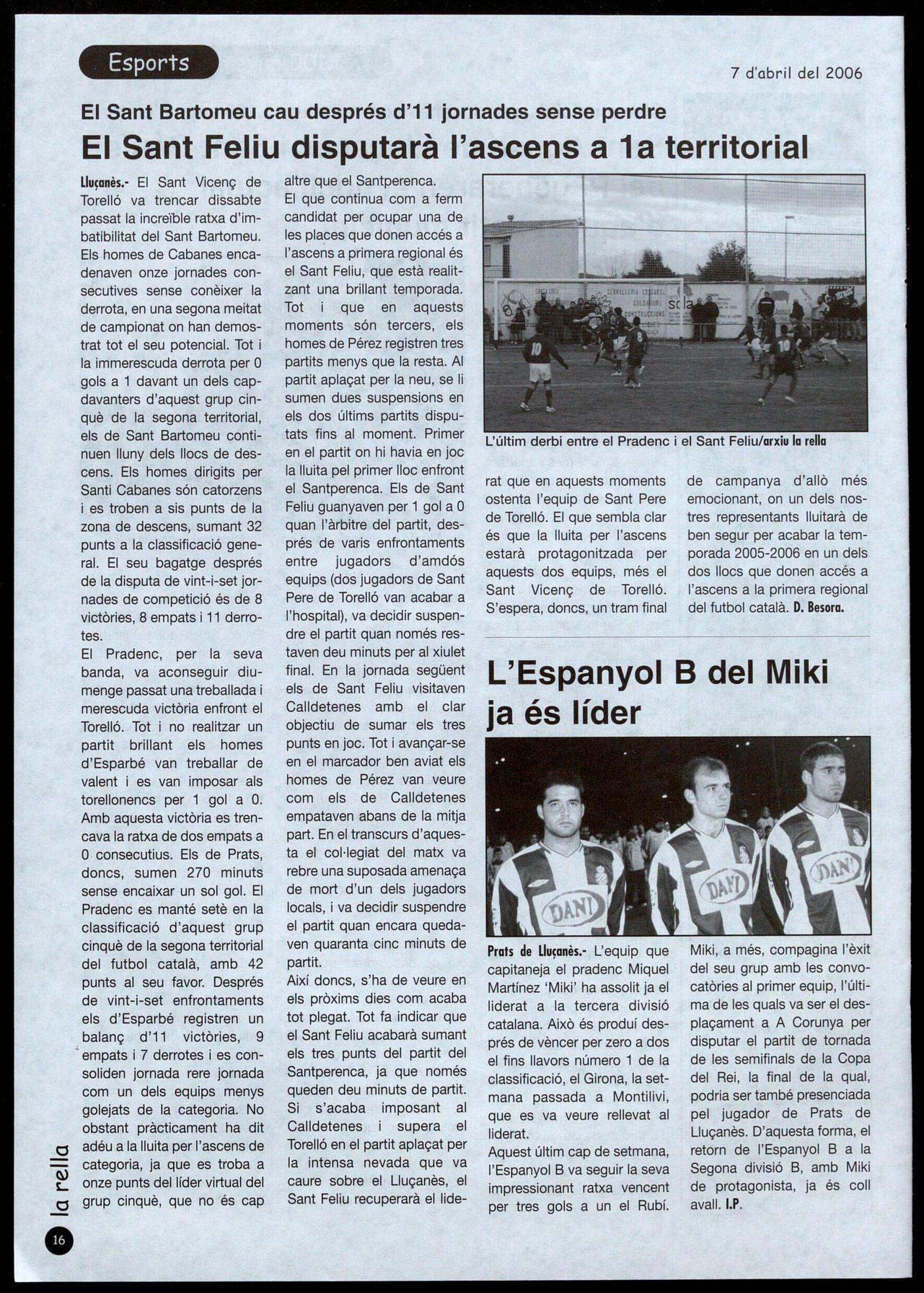 de campanya d'allò més emocionant, on un dels nostres representants lluitarà de ben segur per acabar la temporada 2005-2006 en un deis dos llocs que donen accés a l'ascens a la primera regional del futbol català. D. Besora.