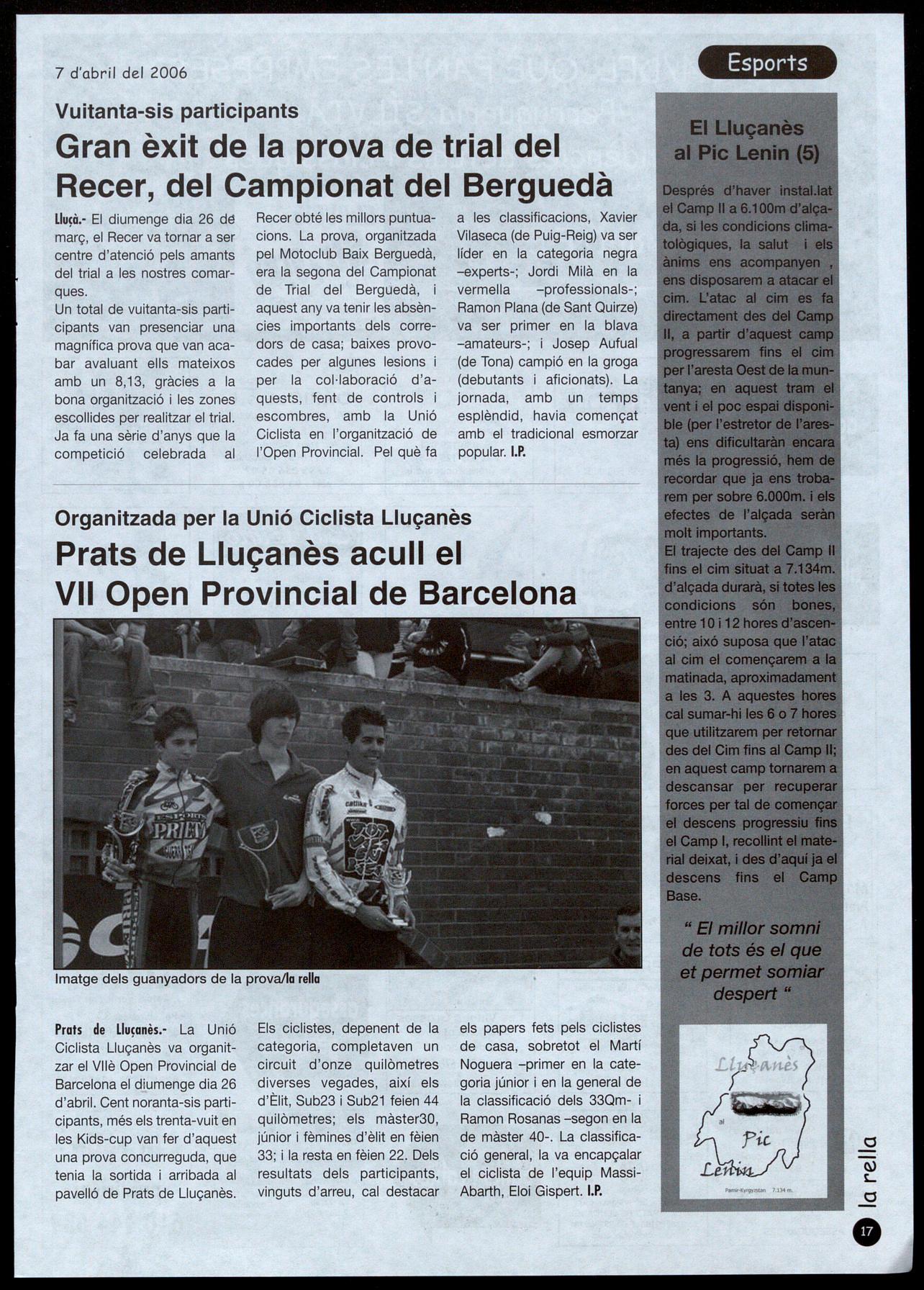 Prats de Lluçanès.- La Unió Ciclista Lluçanès va organitzar el Vllè Open Provincial de Barcelona el diumenge dia 26 d'abril. Cent noranta-sis participants, més els trenta-vuit en les Kids-cup van fer d'aquest una prova concurreguda, que tenia la sortida arribada al pavelló de Prats de Lluçanès.