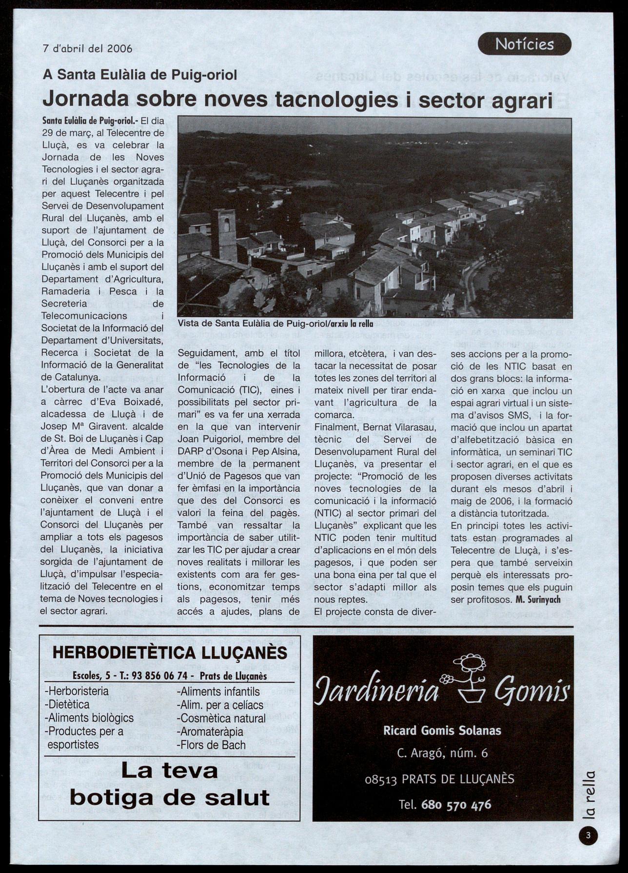 Tecnologies i el sector agrari del Lluçanès organitzada per aquest Telecentre i pel Servei de Desenvolupament Rural del Lluçanès, amb el suport de l'ajuntament de Lluçà, del Consorci per a la Promoció dels Municipis del Lluçanès i amb el suport del Departament d'Agricultura, Ramaderia i Pesca la Secreteria de Telecomunicacions i Societat de la Informació del Departament d'Universitats, Recerca Societat de la Informació de la Generalitat de Catalunya.