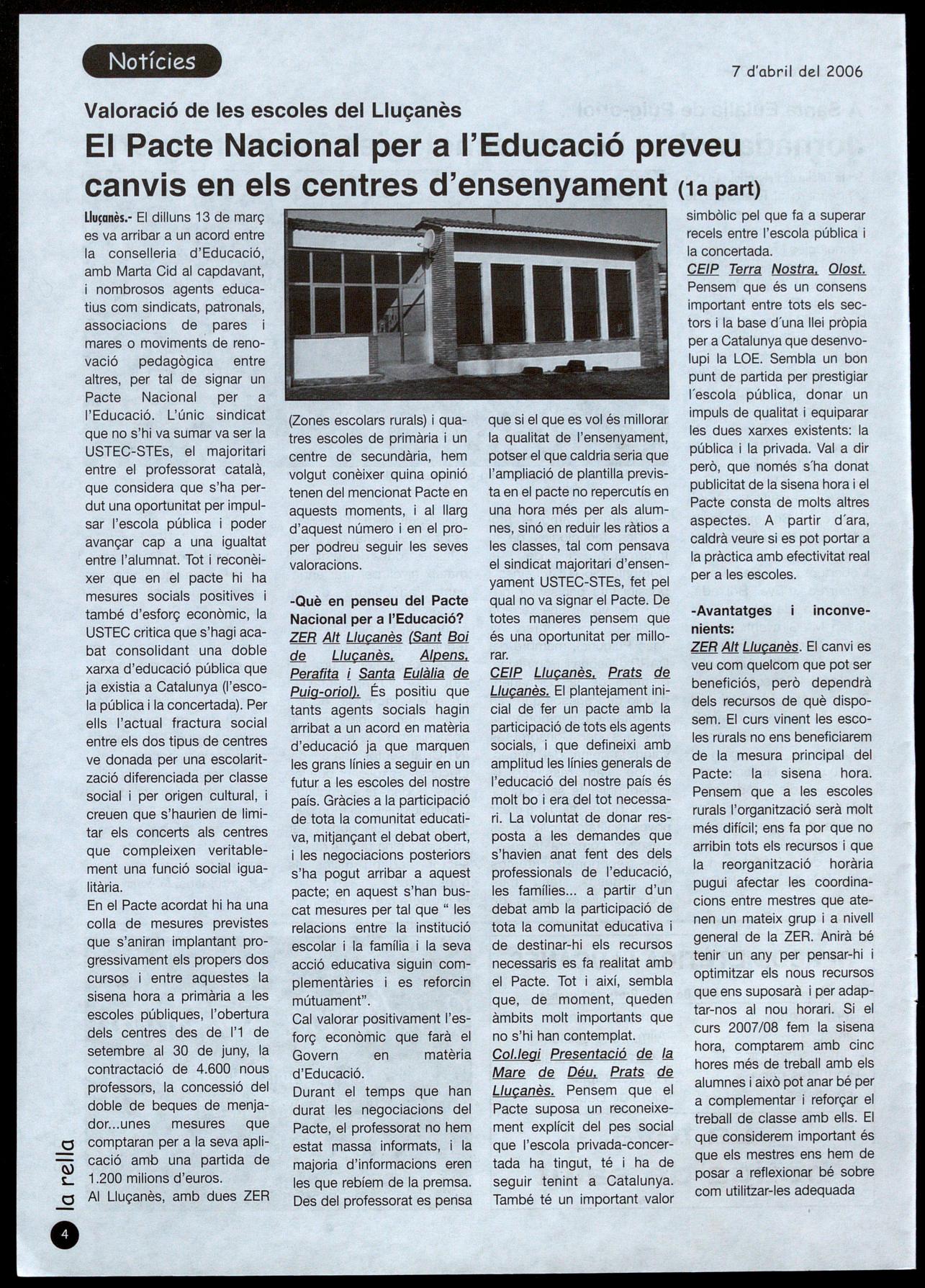-Què en penseu del Pacte Nacional per a l'Educació? ZER Alt Lluçanès (Sant Boi de Lluçanès. Alpens. Perafita i Santa Eulàlia de Puig-orio!). És positiu que tants agents socials hagin arribat a un acord en matèria d'educació ja que marquen les grans línies a seguir en un futur a les escoles del nostre país. Gràcies a la participació de tota la comunitat educativa, mitjançant el debat obert, les negociacions posteriors s'ha pogut arribar a aquest pacte; en aquest s'han buscat mesures per tal que les relacions entre la institució escolar la família i la seva acció educativa siguin complementàries es reforcin mútuament"