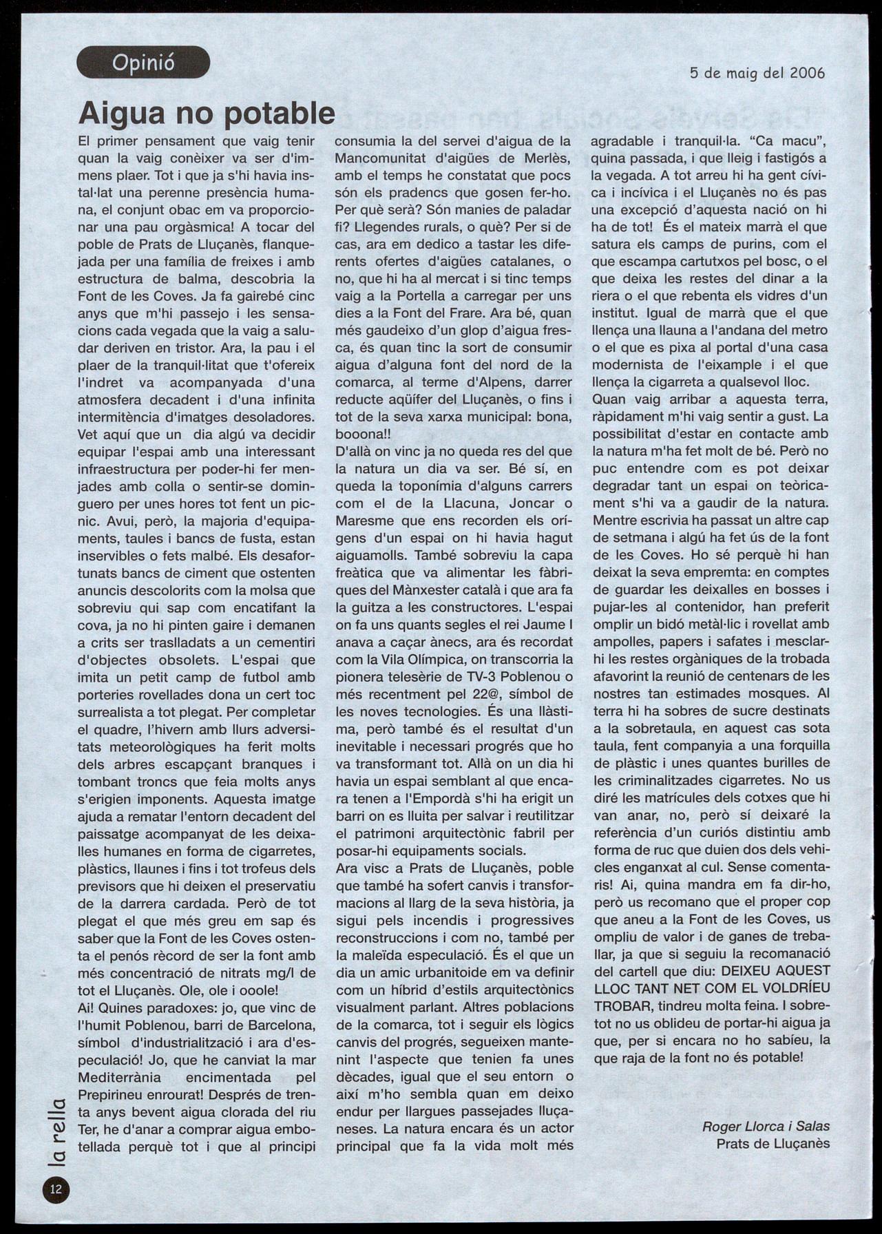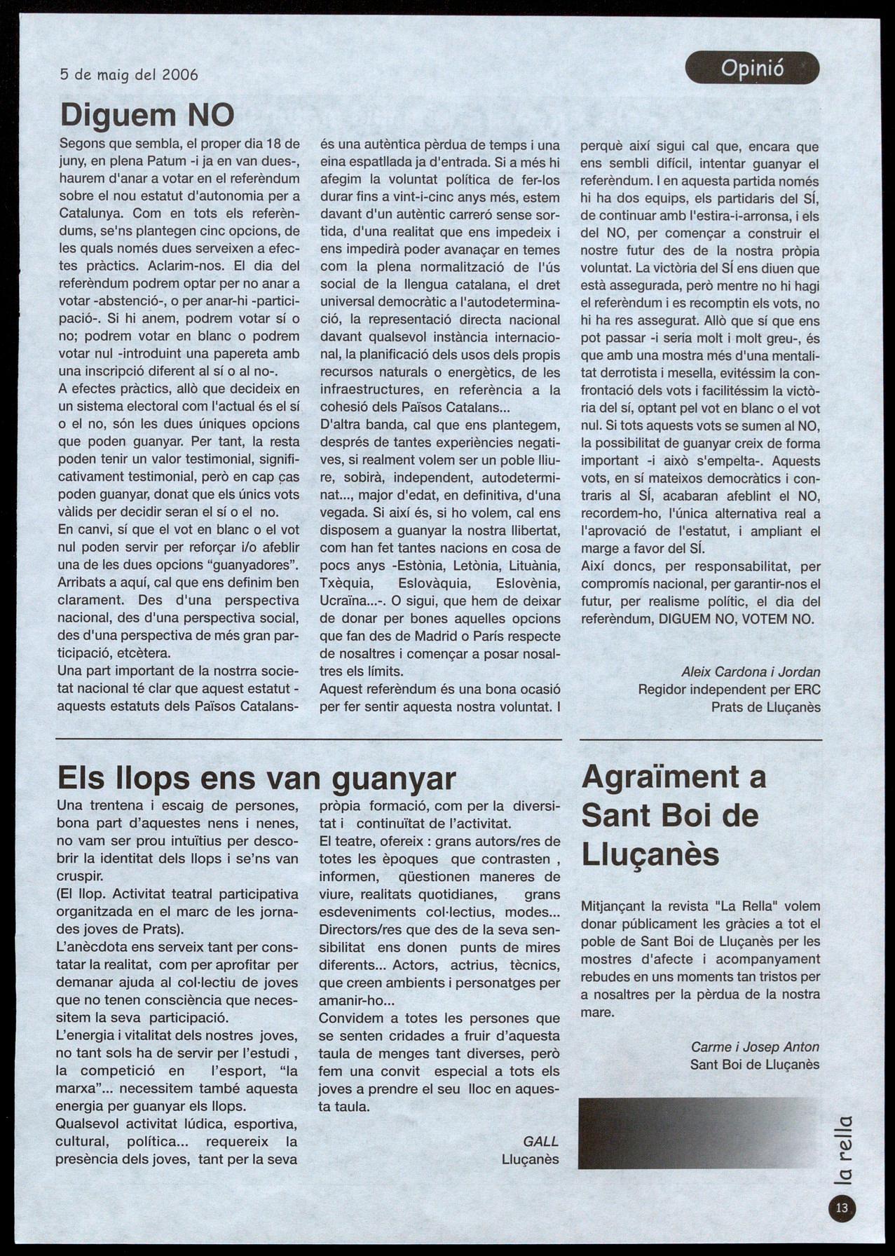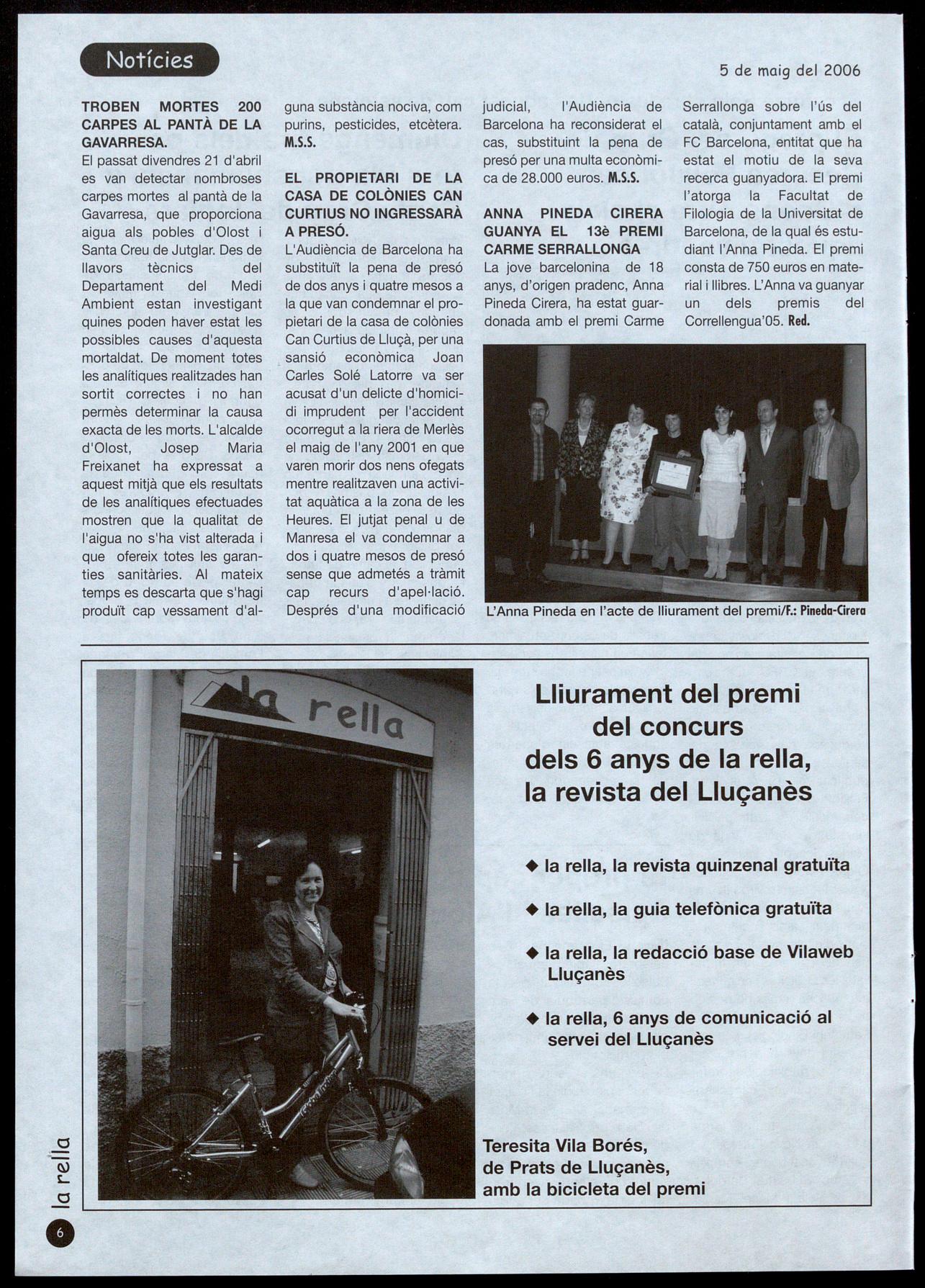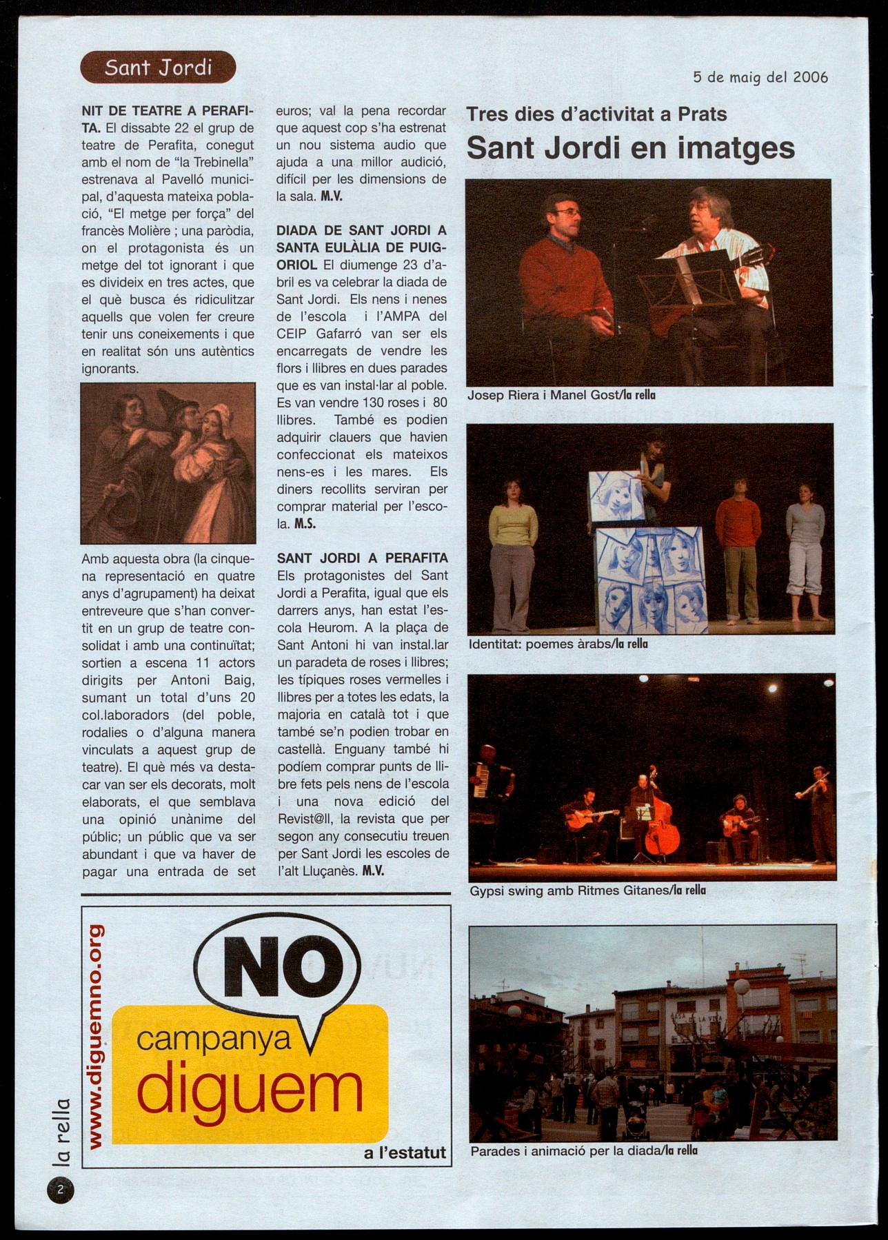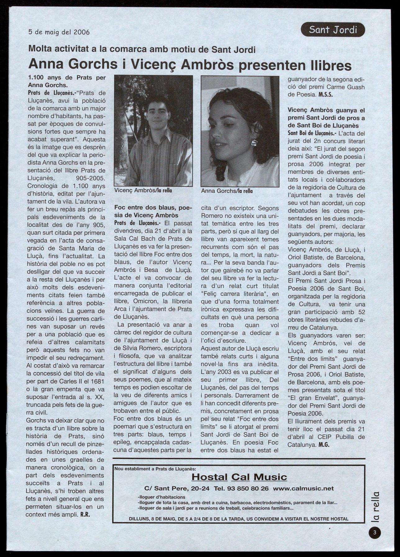 El Premi Sant Jordi Prosa Poesia 2006 de Sant Boi, organitzada per la regidoria de Cultura, va tenir una gran participació amb 52 obres literàries rebudes d'arreu de Catalunya. Els guanyadors varen ser: Vicenç Ambrós, veí de Lluçà, amb el seu relat "Entre dos límits" guanyador del Premi Sant Jordi de Prosa 2006, Oriol Batiste, de Barcelona, amb els poemes presentats sota el títol "El gran Envelat", guanyador del Premi Sant Jordi de Poesia 2006.