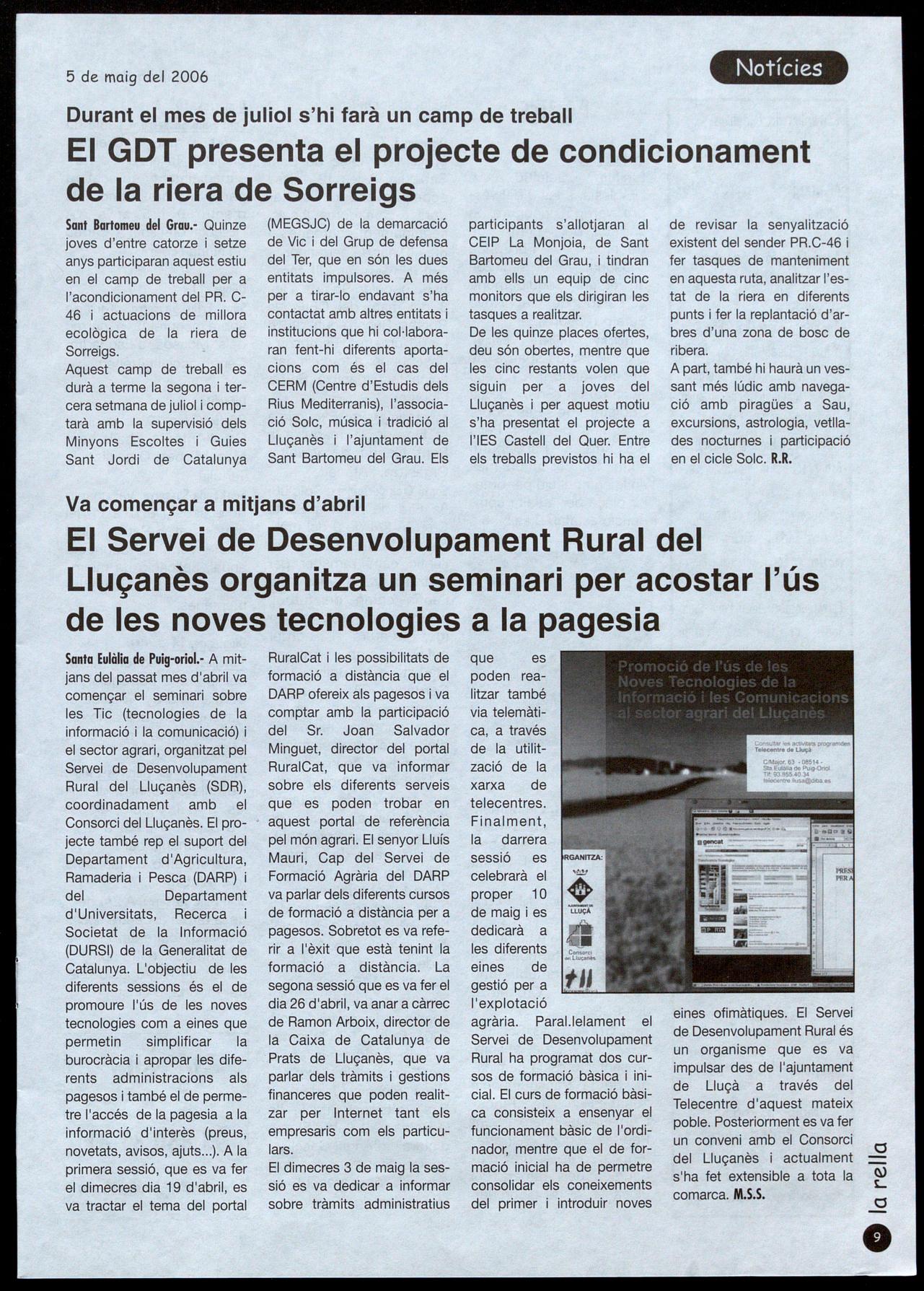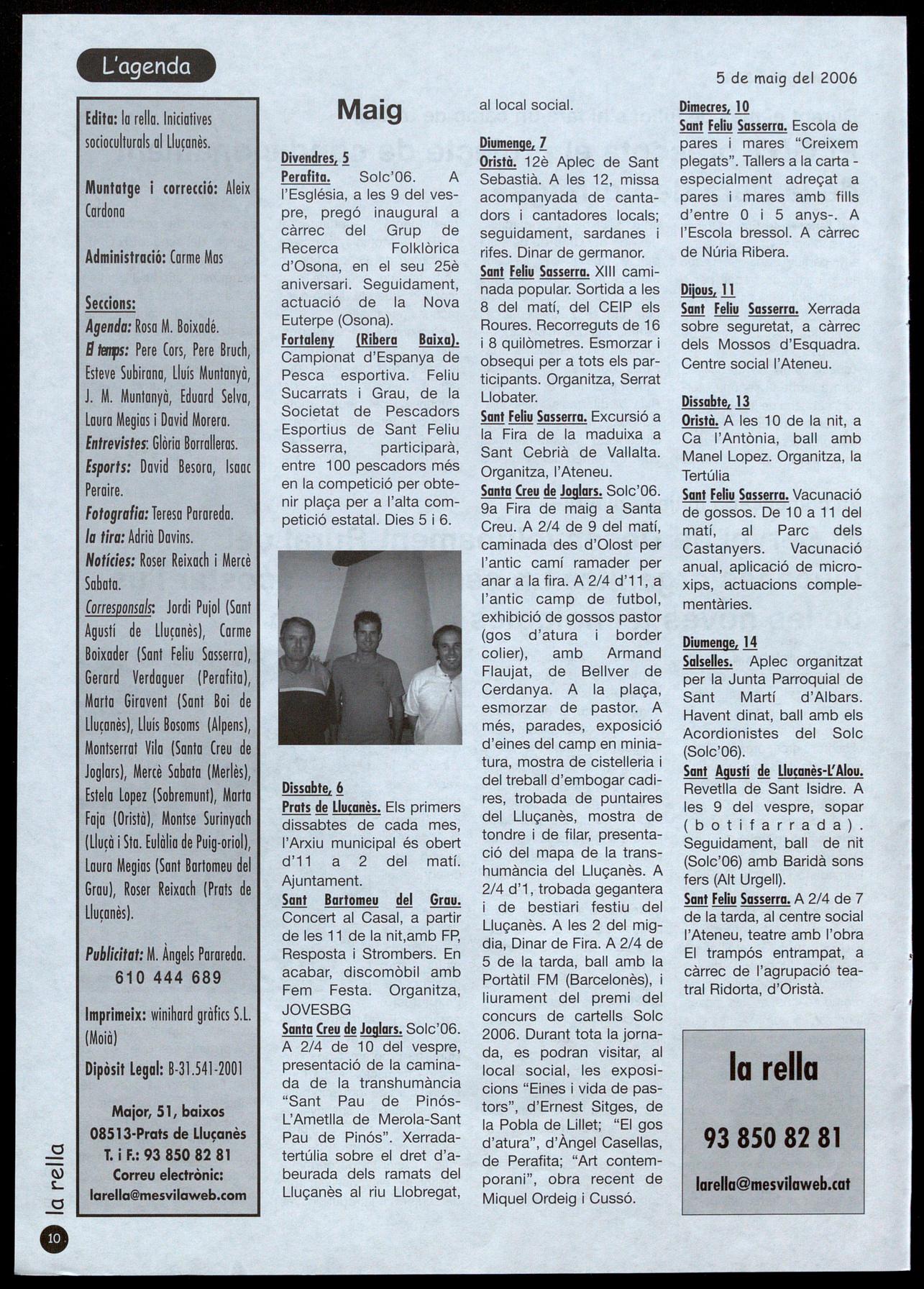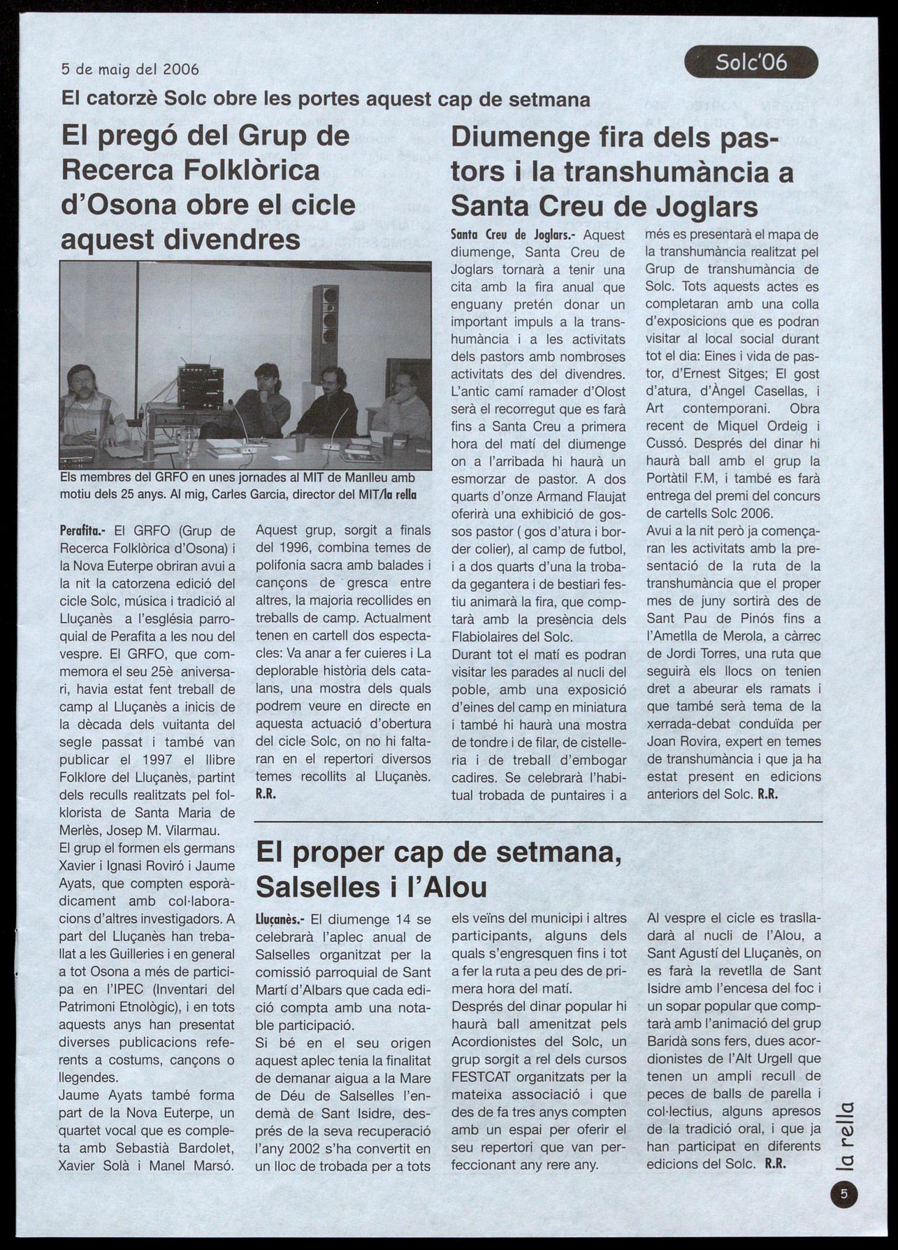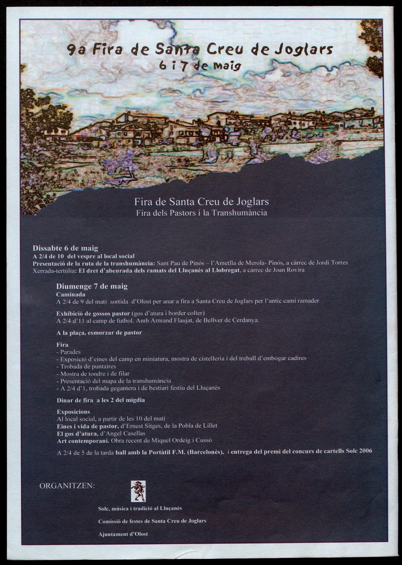 més es presentarà el mapa de la transhumància realitzat pel Grup de transhumància de Solc. Tots aquests actes es completaran amb una colla d'exposicions que es podran visitar al local social durant tot el dia: Eines vida de pastor, d'Ernest Sitges; El gost d'atura, d'Àngel Casellas, Art contemporani. Obra recent de Miquel Ordeig i Cussó. Després del dinar hi haurà ball amb el grup la Portàtil F.M, també es farà entrega del premi del concurs de cartells Solc 2006. Avui a la nit però ja començaran les activitats amb la presentació de la ruta de la transhumància que el proper mes de juny sortirà des de Sant Pau de Pinós fins a l'Ametlla de Merola, a càrrec de Jordi Torres, una ruta que seguirà els llocs on tenien dret a abeurar els ramats que també serà tema de la xerrada-debat conduïda per Joan Rovira, expert en temes de transhumància que ja ha estat present en edicions anteriors del Solc. R.R.