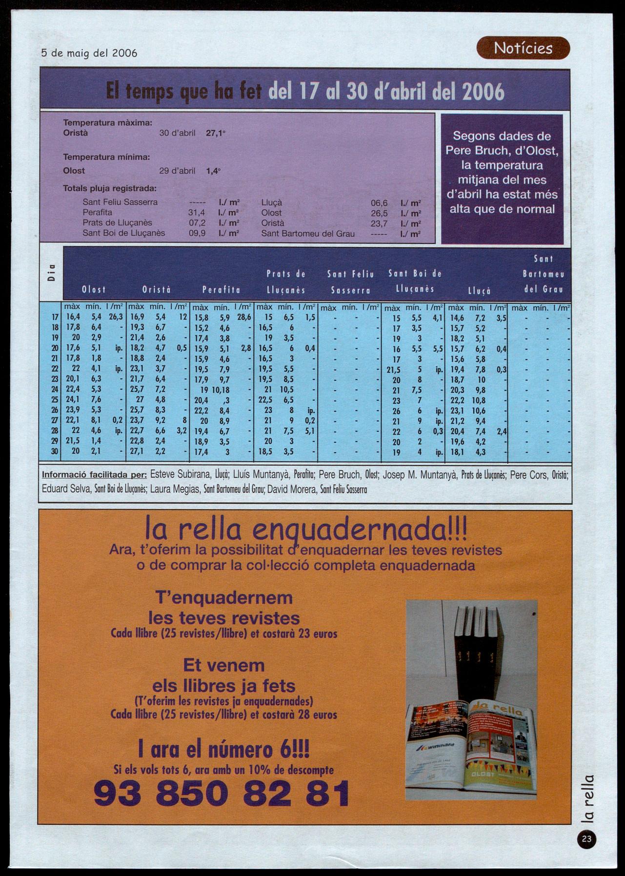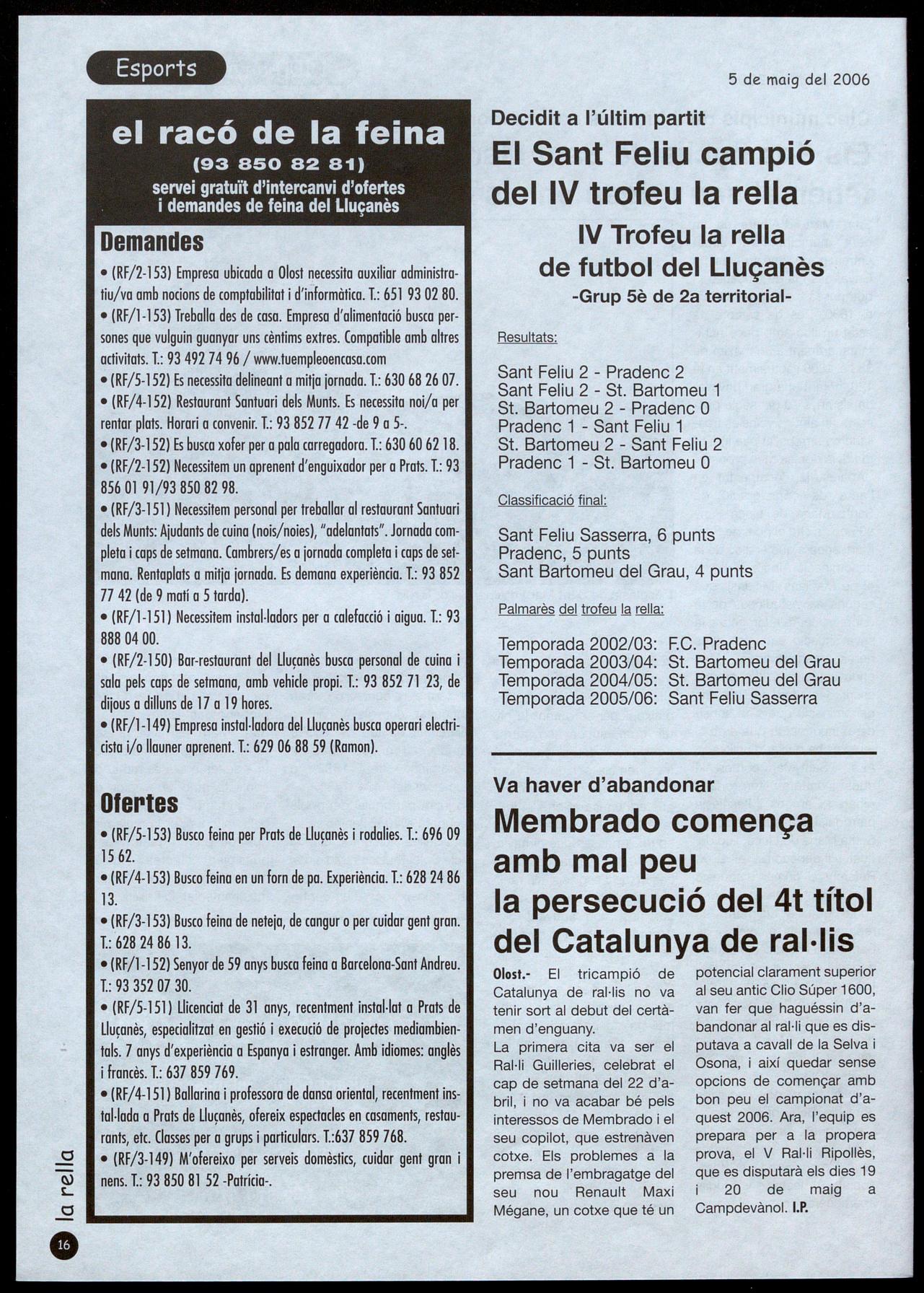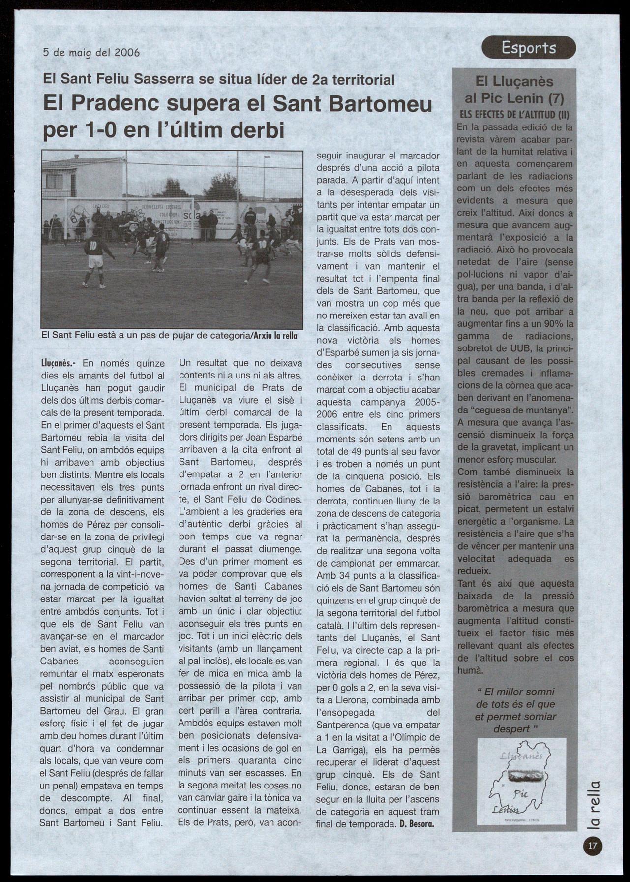 seguir inaugurar el marcador després d'una acció a pilota parada. A partir d'aquí intent a la desesperada deis visitants per intentar empatar un partit que va estar marcat per la igualtat entre tots dos conjunts. Els de Prats van mostrar-se molts sòlids defensivament van mantenir el resultat tot l'empenta final dels de Sant Bartomeu, que van mostra un cop més que no mereixen estar tan avall en la classificació. Amb aquesta nova victòria els homes d'Esparbé sumen ja sis jornades consecutives sense conèixer la derrota s'han marcat com a objectiu acabar aquesta campanya 20052006 entre els cinc primers classificats. En aquests moments són setens amb un total de 49 punts al seu favor es troben a només un punt de la cinquena posició. Els homes de Cabanes, tot la derrota, continuen lluny de la zona de descens de categoria pràcticament s'han assegurat la permanència, després de realitzar una segona volta de campionat per emmarcar. Amb 34 punts a la classificació els de Sant Bartomeu són quinzens en el grup cinquè de la segona territorial del futbol català. I l'últim dels representants del Lluçanès, 'el Sant Feliu, va directe cap a la primera regional. I és que la victòria dels homes de Pérez, per O gols a 2, en la seva visita a Llerona, combinada amb l'ensopegada del Santperenca (que va empatar a 1 en la visitat a l'Olímpic de La Garriga), els ha permès recuperar el liderat d'aquest grup cinquè. Els de Sant Feliu, doncs, estaran de ben segur en la lluita per l'ascens de categoria en aquest tram final de temporada. D. Besora.