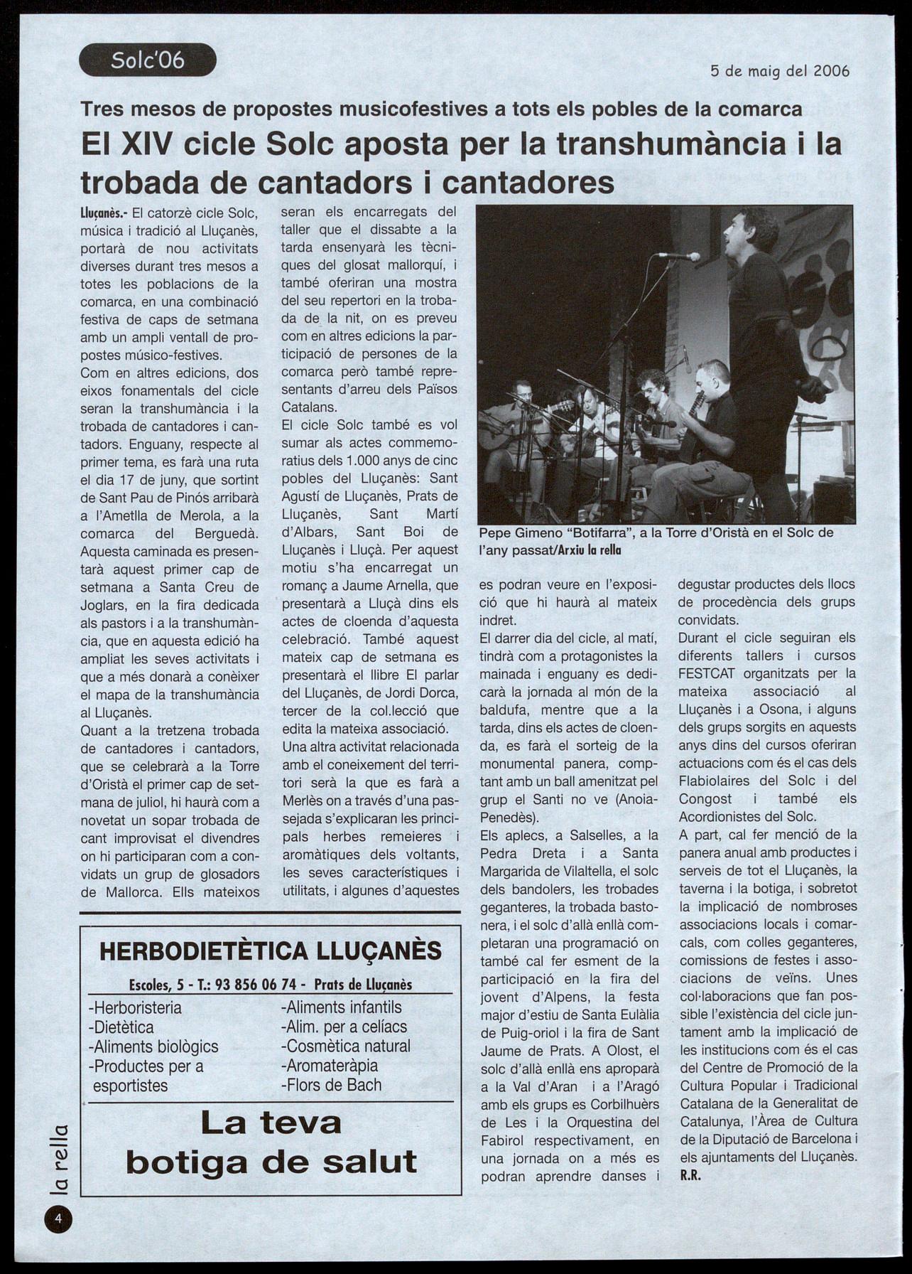 Lluçanès.- El catorzè cicle Solc, música tradició al Lluçanès, portarà de nou activitats diverses durant tres mesos a totes les poblacions de la comarca, en una combinació festiva de caps de setmana amb un ampli ventall de propostes músico-festives.