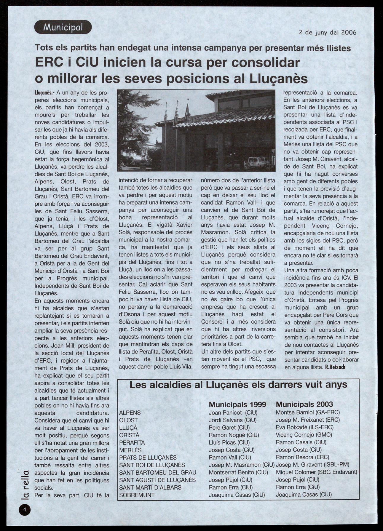Uu�onès.- A un any de les properes eleccions municipals, els partits han començat a moure's per treballar les naves candidatures a impulsar les que ja hi havia als diferents pobles de la comarca. En les eleccions del 2003, CiU, que fins llavors havia estat la força hegemònica al Lluçanès, va perdre les alcaidies de Sant Boi de Lluçanès, Alpens, Olost, Prats de Lluçanès, Sant Bartomeu del Grau Oristà. ERC va irrompre amb força va aconseguir les de Sant Feliu Sasserra, que ja tenia, i les d'Olost, Alpens, Lluçà Prats de Lluçanès, mentre que a Sant Bartomeu del Grau l'alcaldia va ser per al grup Sant Bartomeu del Grau Endavant, a Oristà per a la de Gent del Municipi d'Oristà a Sant Boi per a Progrés municipal. Independents de Sant Boi de Lluçanès.