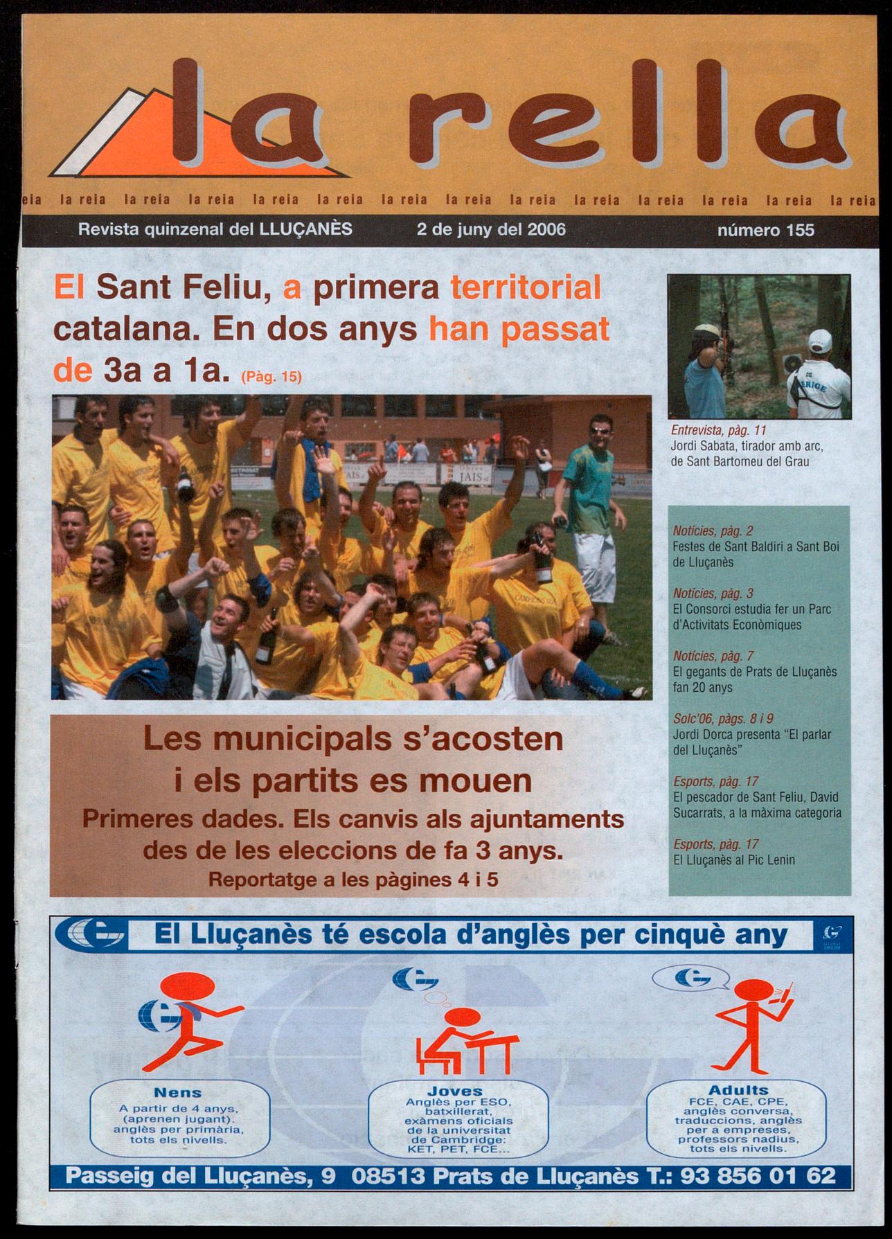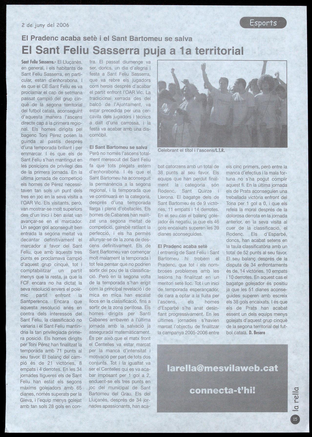 Sant Feliu Sasserra.- El Lluçanès, en general, els habitants de Sant Feliu Sasserra, en particular, estan d'enhorabona, és que el CE Sant Feliu es va proclamar el cap de setmana passat campió del grup cinquè de la segona territorial del futbol català, aconseguint d'aquesta manera l'ascens directe cap a la primera regional. Els homes dirigits pel bagenc Toni Pérez posen la guinda al pastís després d'una temporada brillant i per emmarcar, és que els de Sant Feliu s'han mantingut en les posicions de privilegi des de la primera jornada, En la última jornada de competició els homes de Pérez necessitaven tan sols un punt dels tres en joc en la seva visita a I'OAR Vic, Els visitants, però, van mostrar-se molt superiors des d'un inici ben aviat van avançar-se en el marcador, Un segon gol aconseguit ben entrada la segona meitat va decantar definitivament el marcador a favor del Sant Feliu, que amb aquests tres punts es proclamava campió d'aquest grup cinquè, tot comptabilitzar un partit menys que la resta, ja que la FCF encara no ha dictat la seva resolució envers el polèmic partit enfront la Santperenca, Encara que aquesta resolució anés en contra dels interessos del Sant Feliu, la classificació no variaria el Sant Feliu mantindria la tan privilegiada primera posició, Els homes dirigits per Toni Pérez han finalitzat la temporada amb 71 punts al seu favor, El balanç del campió és de 21 victòries, 8 empats 4 derrotes, En les 34 jornades lIigueres els de Sant Feliu han estat els segons màxims golejadors amb 65 dianes, només superats per la Gleva, i l'equip menys golejat amb tan sols 28 gols en contra. El passat diumenge va ser, doncs, un dia d'alegria i festa a Sant Feliu Sasserra, que va rebre els jugadors com herois després d'acabar el partit enfront I'OAR Vic. La tradicional xerrada des del balcó de l'Ajuntament, va estar precedida per una cercavila dels jugadors tècnics a dalt d'una carrossa, la festa va acabar amb una discomòbil.