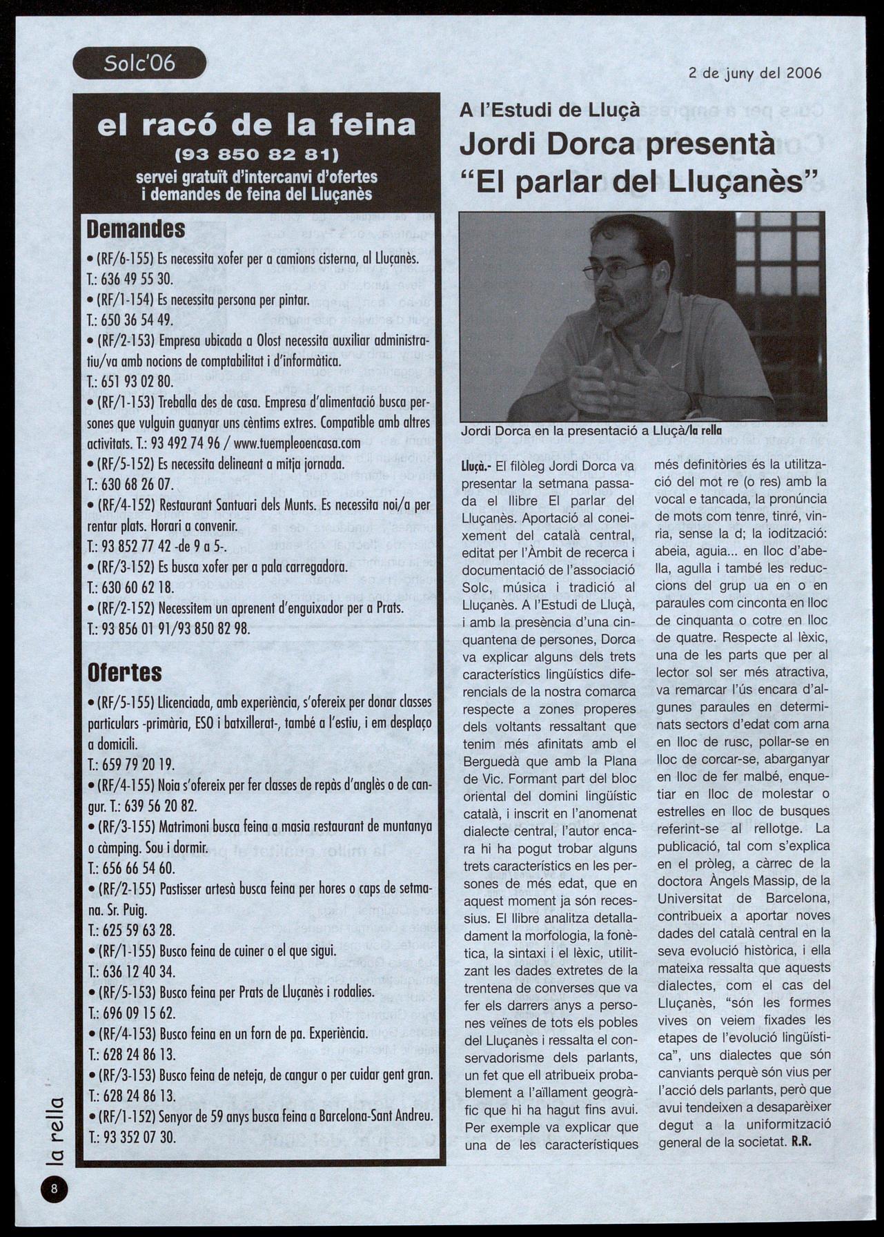 número dos de l'anterior llista però que va passar a ser-ne el cap en deixar el seu lloc el candidat Ramon Vall- i que canvien el de Sant Boi de Lluçanès, que durant molts anys havia estat Josep M. Masramon. Solà critica la gestió que han fet els polítics d'ERC i els seus aliats al Lluçanès perquè considera que no s'ha treballat suficientment per redreçar el territori que el canvi que esperaven els seus habitants no es veu enlloc. Afegeix que no és gaire bo que l'única empresa que ha crescut al Lluçanès hagi estat el Consorci i a més considera que hi ha altres inversions prioritàries a part de la carretera fins a Olost. Un altre dels partits que s'estan movent és el PSC, que sempre ha tingut una escassa
