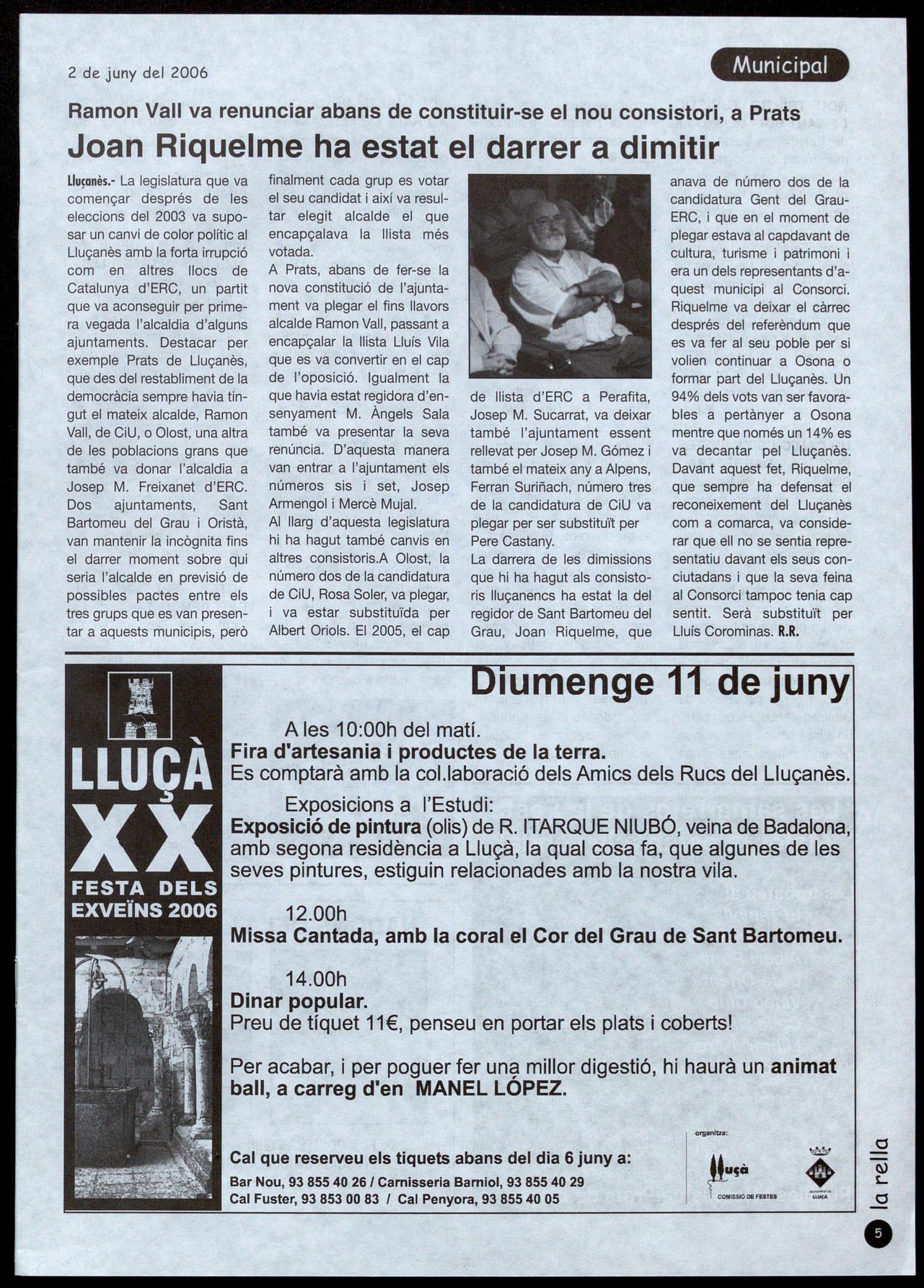 de llista d'ERC a Perafita, Josep M. Sucarrat, va deixar també l'ajuntament essent rellevat per Josep M. Gómez i també el mateix any a Alpens, Ferran Suriñach, número tres de la candidatura de CiU va plegar per ser substituït per Pere Castany. La darrera de les dimissions que hi ha hagut als consistoris lIuçanencs ha estat la del regidor de Sant Bartomeu del Grau, Joan Riquelme, que