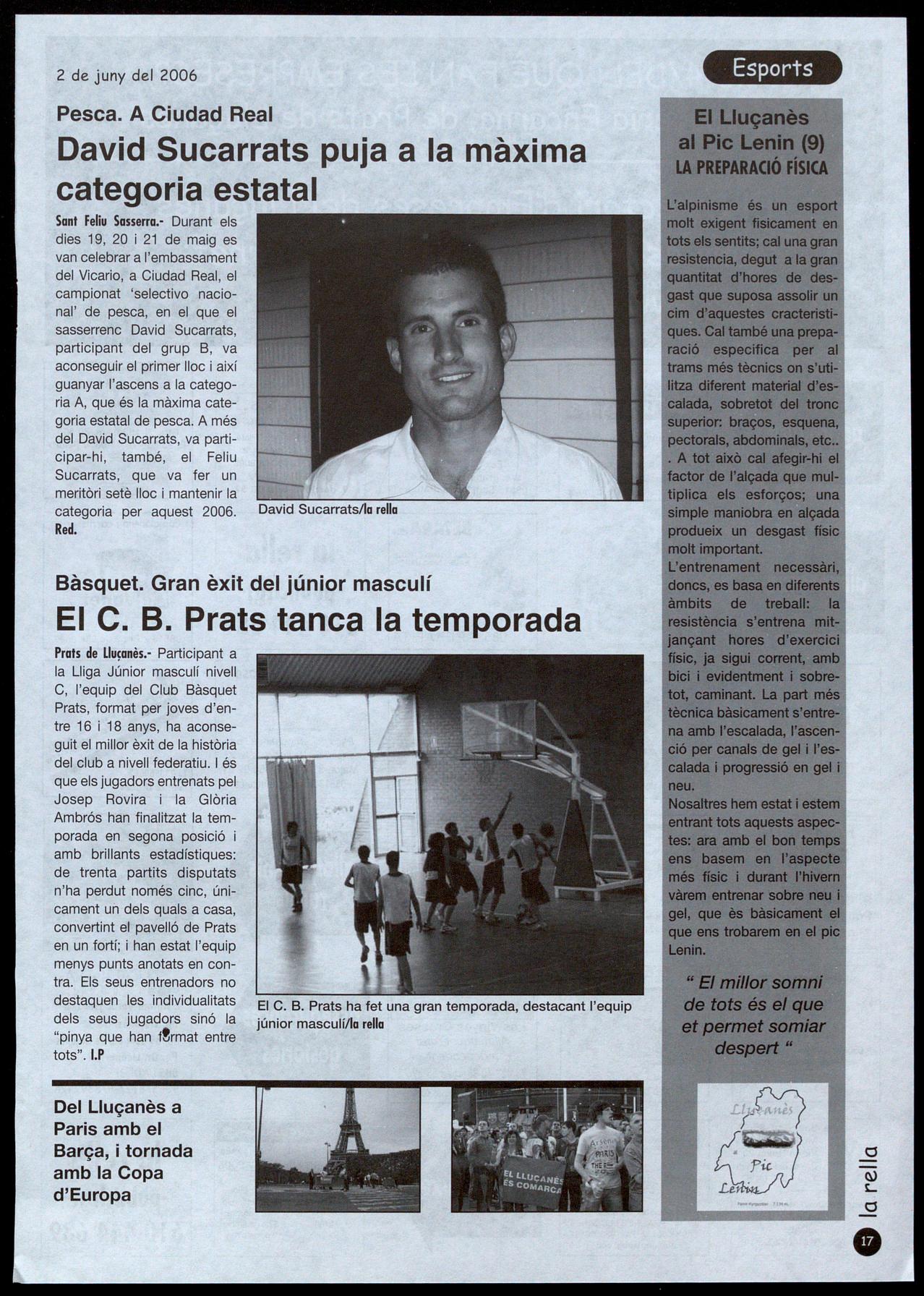 Sant Feliu Sasserra.- Durant els dies 19, 20 21 de maig es van celebrar a l'embassament del Vicario, a Ciudad Real, el campionat 'selectivo nacional' de pesca, en el que el sasserrenc David Sucarrats, participant del grup B, va aconseguir el primer lloc així guanyar l'ascens a la categoria A, que és la màxima categoria estatal de pesca. A més del David Sucarrats, va participar-hi, també, el Feliu Sucarrats, que va fer un meritòri setè lloc mantenir la categoria per aquest 2006. David Sucarrats/la rella Red.