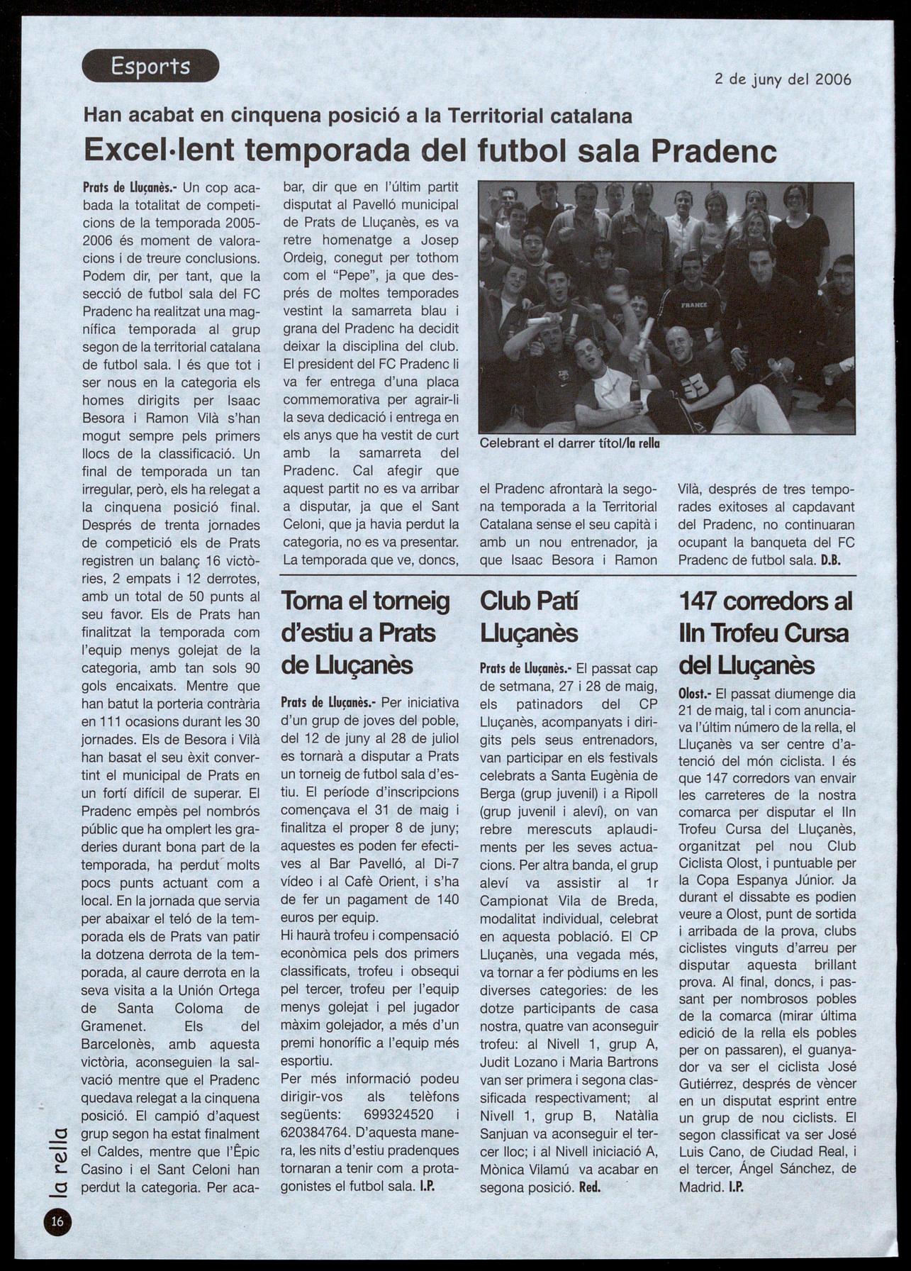 Prals de L1u�anès.· Un cop acabada la totalitat de competicions de la temporada 20052006 és moment de valoracions i de treure conclusions. Podem dir, per tant, que la secció de futbol sala del FC Pradenc ha realitzat una magnífica temporada al grup segon de la territorial catalana de futbol sala. és que tot ser nous en la categoria els homes dirigits per Isaac Besora Ramon Vilà s'han mogut sempre pels primers llocs de la classificació. Un final de temporada un tan irregular, però, els ha relegat a la cinquena posició final. Després de trenta jornades de competició els de Prats registren un balanç 16 victòries, 2 empats 12 derrotes, amb un total de 50 punts al seu favor. Els de Prats han finalitzat la temporada com l'equip menys golejat de la categoria, amb tan sols 90 gols encaixats. Mentre que han batut la porteria contrària en 111 ocasions durant les 30 jornades. Els de Besora Vilà han basat el seu èxit convertint el municipal de Prats en un fortí difícil de superar. El Pradenc empès pel nombrós públic que ha omplert les graderies durant bona part de la temporada, ha perdut' molts pocs punts actuant com a local. En la jornada que servia per abaixar el teló de la temporada els de Prats van patir la dotzena derrota de la temporada, al caure derrota en la seva visita a la Unión Ortega de Santa Coloma de Gramenet. Els del Barcelonès, amb aquesta victòria, aconseguien la salvació mentre que el Pradenc quedava relegat a la cinquena posició. El campió d'aquest grup segon ha estat finalment el Caldes, mentre que l'Êpic Casino el Sant Celoni han perdut la categoria. Per aca-