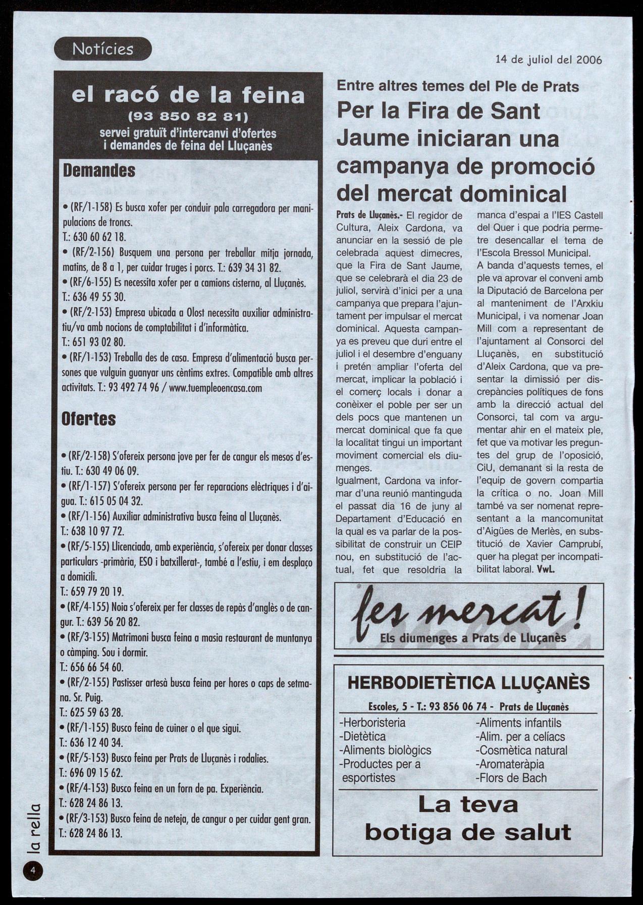 Prats de L1uçanès.- El regidor de Cultura, Aleix Cardona, va anunciar en la sessió de ple celebrada aquest dimecres, que la Fira de Sant Jaume, que se celebrarà el dia 23 de juliol, servirà d'inici per a una campanya que prepara l'ajuntament per impulsar el mercat dominical. Aquesta campanya es preveu que duri entre el juliol el desembre d'enguany pretén ampliar l'oferta del mercat, implicar la població el comerç locals i donar a conèixer el poble per ser un dels pocs que mantenen un mercat dominical que fa que la localitat tingui un important moviment comercial els diumenges. Igualment, Cardona va informar d'una reunió mantinguda el passat dia 16 de juny al Departament d'Educació en la qual es va parlar de la possibilitat de construir un CEIP nou, en substitució de l'actual, fet que resoldria la