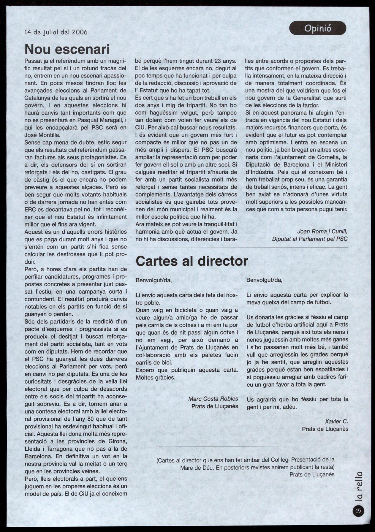 lles entre acords o propostes dels partits que conformen el govern. Es treballa intensament, en la mateixa direcció i de manera totalment coordinada. És una mostra del que voldríem que fos el nou govern de la Generalitat que surti de les eleccions de la tardor. Si en aquest panorama hi afegim l'entrada en vigència del nou Estatut dels majors recursos financers que porta, és evident que el futur es pot contemplar amb optimisme. I entra en escena un nou polític, ja ben bregat en altres escenaris com l'ajuntament de Cornellà, la Diputació de Barcelona i el Ministeri d'Indústria. Pels qui el coneixem bé hem treballat prop seu, és una garantia de treball seriós, intens i eficaç. La gent ben aviat se n'adonarà d'unes virtuts molt superiors a les possibles mancances que com a tota persona pugui tenir.
