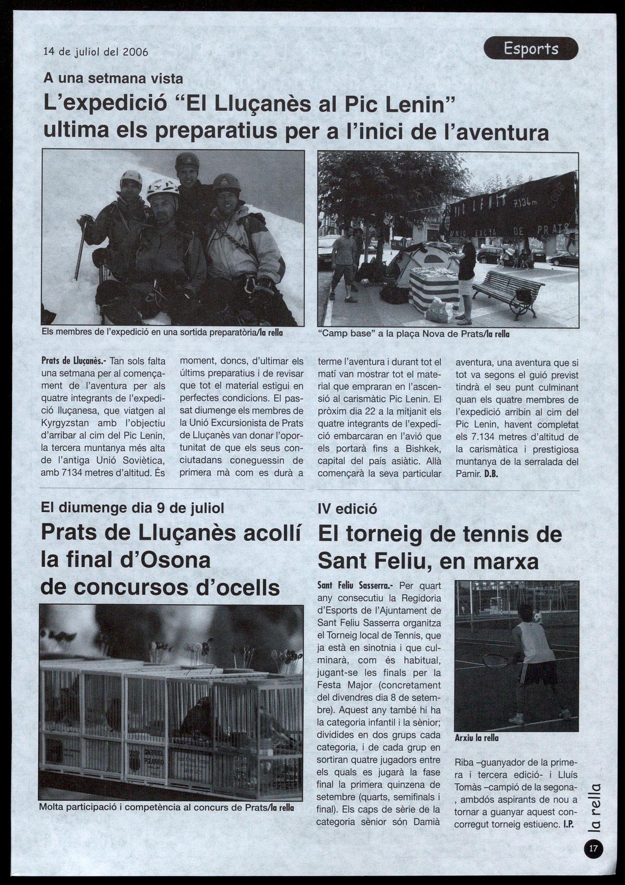 Sont Feliu Sasserra.- Per quart any consecutiu la Regidoria d'Esports de l'Ajuntament de Sant Feliu Sasserra organitza el Torneig local de Tennis, que ja està en sinotnia i que culminarà, com és habitual, jugant-se les finals per la Festa Major (concretament del divendres dia 8 de setembre). Aquest any també hi ha la categoria infantil la sènior; dividides en dos grups cada categoria, i de cada grup en sortiran quatre jugadors entre els quals es jugarà la fase final la primera quinzena de setembre (quarts, semifinals i final). Els caps de sèrie de la categoria sènior són Damià