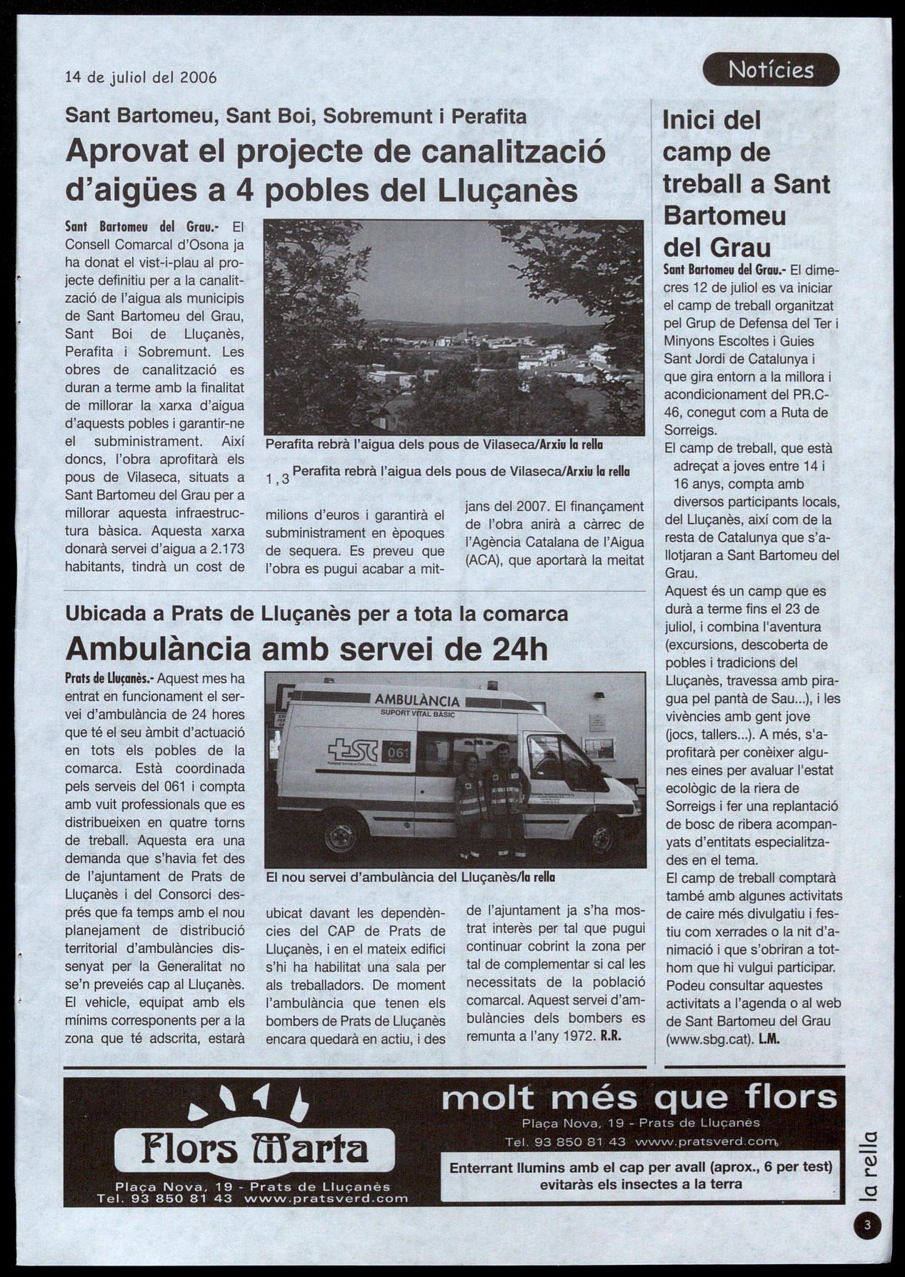 Prals de Lluçanès.-Aquest mes ha entrat en funcionament el servei d'ambulància de 24 hores que té el seu àmbit d'actuació en tots els pobles de la comarca. Està coordinada pels serveis del 061 compta amb vuit professionals que es distribueixen en quatre torns de treball. Aquesta era una demanda que s'havia fet des de l'ajuntament de Prats de Lluçanès del Consorci després que fa temps amb el nou planejament de distribució territorial d'ambulàncies dissenyat per la Generalitat no se'n preveiés cap al Lluçanès. El vehicle, equipat amb els mínims corresponents per a la zona que té adscrita, estarà