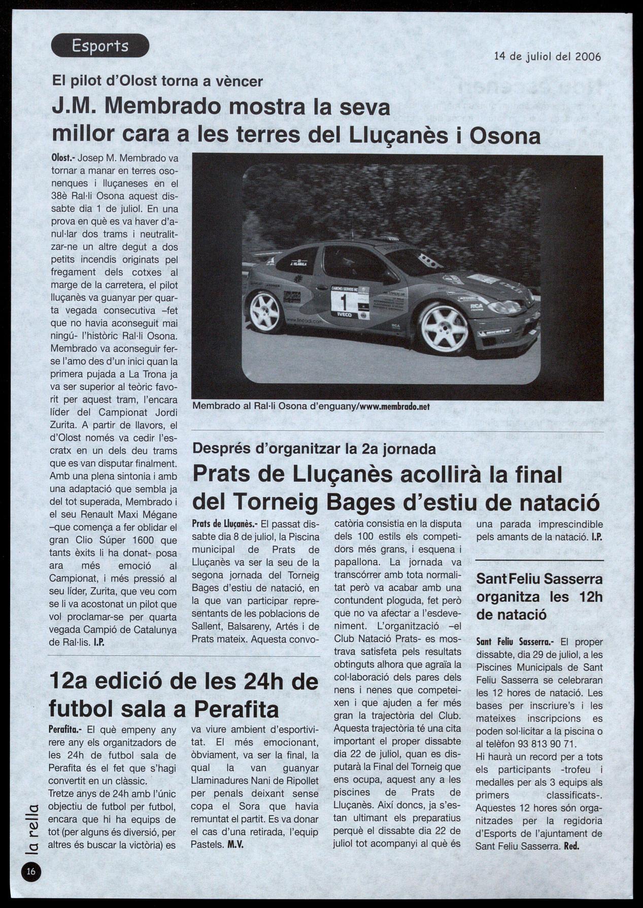 Olost.· Josep M. Membrado va tornar a manar en terres osonenques i lluçaneses en el 38è Ral·li Osona aquest dissabte dia 1 de juliol. En una prova en què es va haver d'anul·lar dos trams i neutralitzar-ne un altre degut a dos petits incendis originats pel fregament dels cotxes al marge de la carretera, el pilot lluçanès va guanyar per quarta vegada consecutiva -fet que no havia aconseguit mai ningú- l'històric Ral·li Osona. Membrado va aconseguir ferse l'amo des d'un inici quan la primera pujada a La Trona ja va ser superior al teòric favorit per aquest tram, l'encara líder del Campionat Jordi Zurita. A partir de llavors, el d'Olost només va cedir I'escratx en un dels deu trams que es van disputar finalment. Amb una plena sintonia amb una adaptació que sembla ja del tot superada, Membrado el seu Renault Maxi Mégane -que comença a fer oblidar el gran Clio Súper 1600 que tants èxits li ha donat- posa ara més emoció al Campionat, i més pressió al seu líder, Zurita, que veu com se Ii va acostonat un pilot que vol proclamar-se per quarta vegada Campió de Catalunya de Ral·lis. I.P.