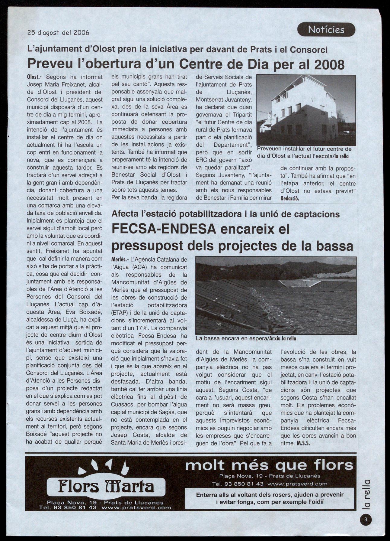 Josep Maria Freixanet, alcalde d'Olost president del Consorci del Lluçanès, aquest municipi disposarà d'un centre de dia a mig termini, aproximadament cap al 2008. La intenció de l'ajuntament és instal·lar el centre de dia on actualment hi ha l'escola un cop entri en funcionament la nova, que es començarà a construir aquesta tardor. Es tractarà d'un servei adreçat a la gent gran i amb dependència, donant cobertura a una necessitat molt present en una comarca amb una elevada taxa de població envellida.