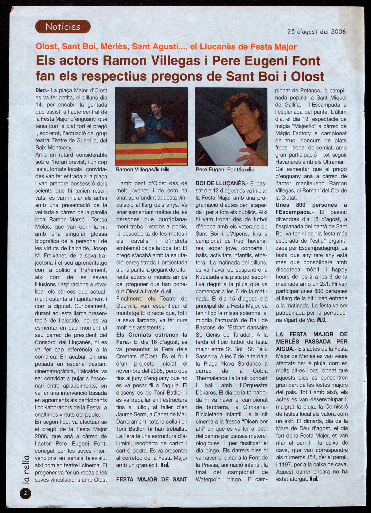 Els Cremats estrenen la Fera.- El dia 16 d'agost, es va presentar la Fera deis Cremats d'Olost. És el fruit d'un projecte iniciat el novembre del 2005, però que fins al juny d'enguany que no es va posar fil a l'agulla. El disseny és de Toni Batllori i es va treballar en l'estructura fins al juliol, al taller d'en Jaume Serra, a Canet de Mar. Darrerament, tota la colla i en Toni Batllori hi han treballat.