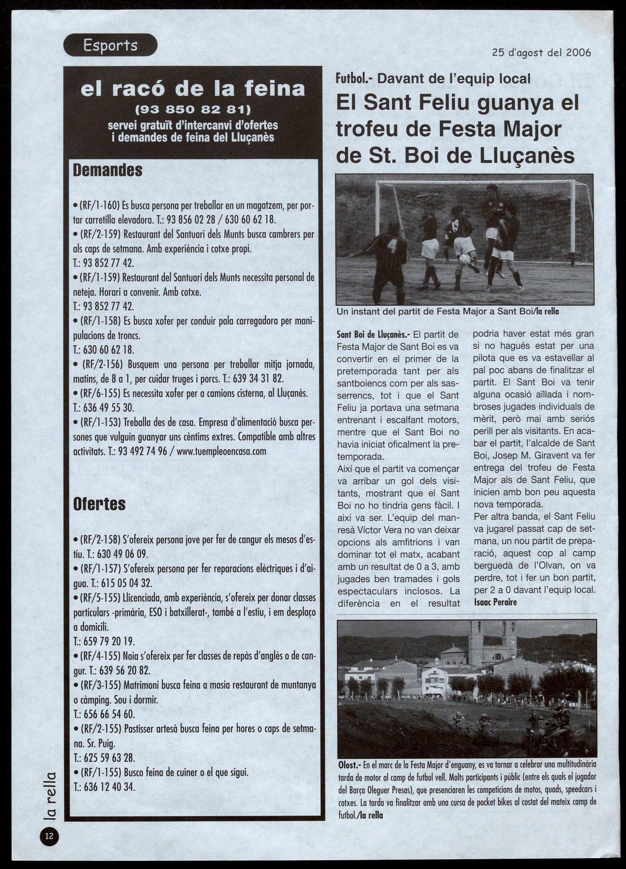 Diumenge, � Prats de Llucanès." Festa de lIiurament-d""8îaPanera 2006 de Solc. AI final del Passeig, a 2/4 de 6 de la tarda. Actuació musical berenar per a tothom. Sant Feliu Sasserra." Festa del Barri de Sant Roc. A la tarda, gimcana de tractors. AI vespre, sopar per a tothom i ball amb el Joan d'Avinyó. Exhibició de balls de saló bingo.