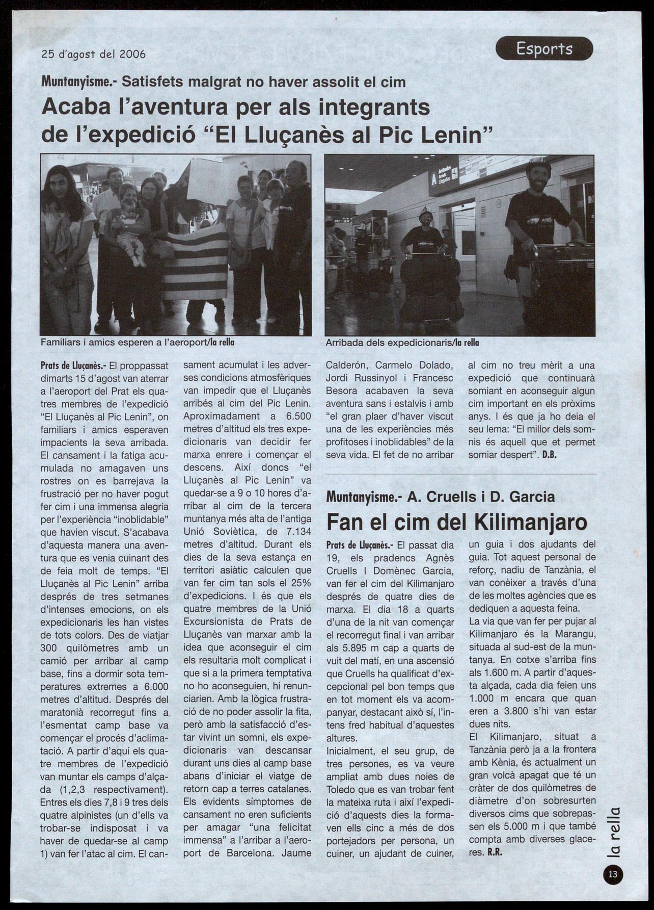 Prats de L1uçanès.- El proppassat dimarts 15 d'agost van aterrar a l'aeroport del Prat els quatres membres de l'expedició "El Lluçanès al Pic Lenin", on familiars amics esperaven impacients la seva arribada. El cansament la fatiga acumulada no amagaven uns rostres on es barrejava la frustració per no haver pogut fer cim i una immensa alegria per l'experiència "inoblidable" que havien viscut. S'acabava d'aquesta manera una aventura que es venia cuinant des de feia molt de temps. "El Lluçanès al Pic Lenin" arriba després de tres setmanes d'intenses emocions, on els expedicionaris les han vistes de tots colors. Des de viatjar 300 quilòmetres amb un camió per arribar al camp base, fins a dormir sota temperatures extremes a 6.000 metres d'altitud. Després del maratonià recorregut fins a l'esmentat camp base va començar el procés d'aclimatació. A partir d'aquí els quatre membres de l'expedició van muntar els camps d'alçada (1,2,3 respectivament).