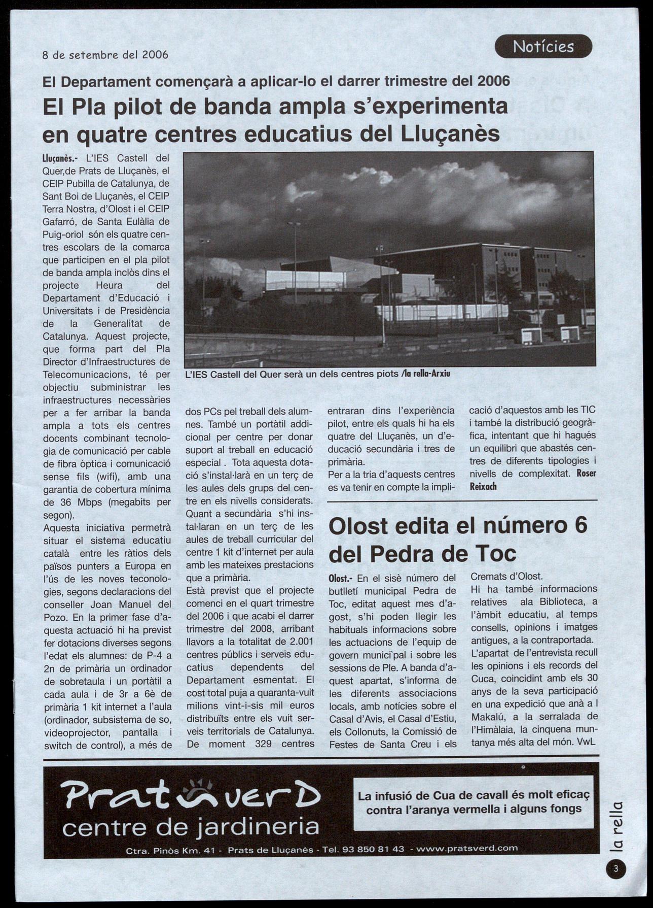 L1u�anès.- L'lES Castell del Quer,de Prats de Lluçanès, el CEIP Pubilla de Catalunya, de Sant Boi de Lluçanès, el CEIP Terra Nostra, d'Olost el CEIP Gafarró, de Santa Eulàlia de Puig-oriol són els quatre centres escolars de la comarca que participen en el pla pilot de banda ampla inclòs dins el projecte Heura del Departament d'Educació i Universitats i de Presidència de la Generalitat de Catalunya. Aquest projecte, que forma part del Pla Director d'Infraestructures de Telecomunicacions, té per objectiu subministrar les infraestructures necessàries per a fer arribar la banda ampla a tots els centres docents combinant tecnologia de comunicació per cable de fibra òptica comunicació sense fils (wifi), amb una garantia de cobertura mínima de 36 Mbps (megabits per segon).
