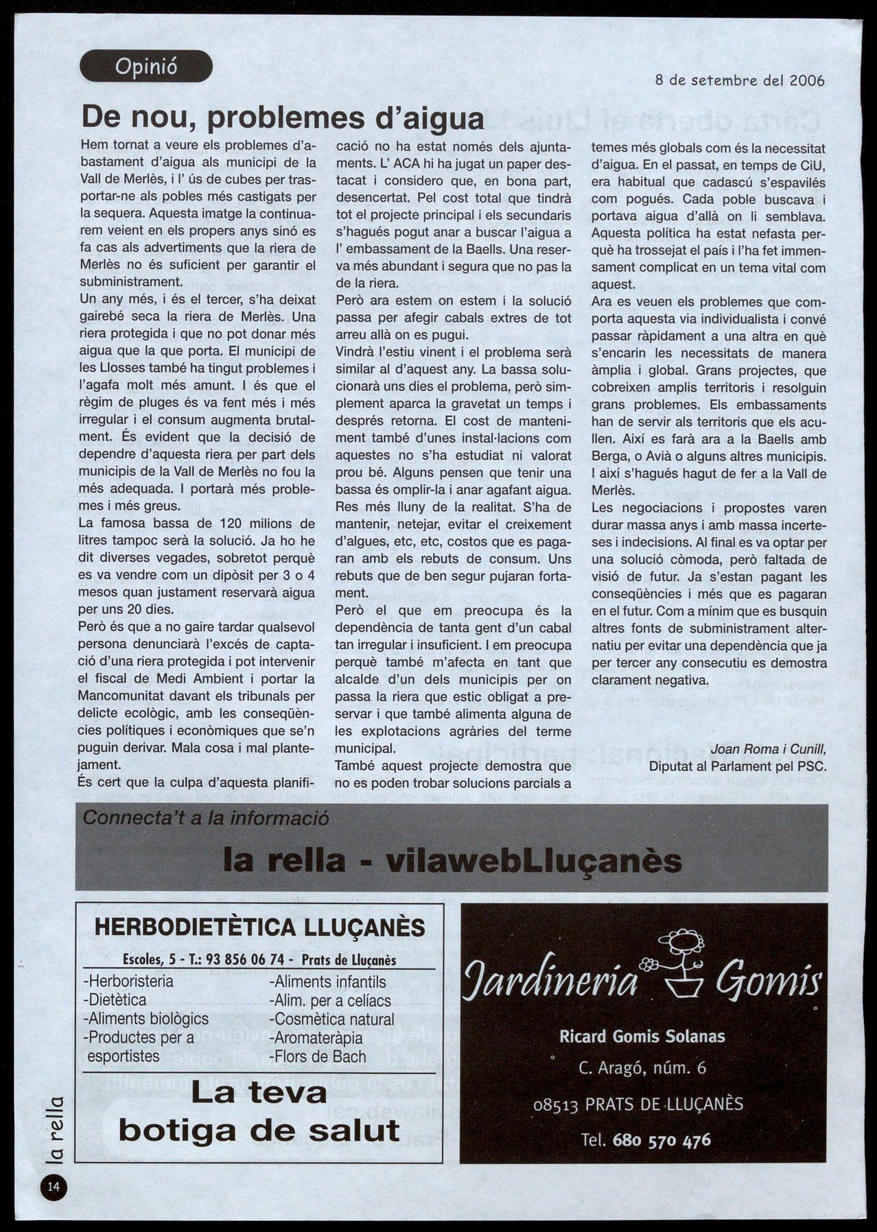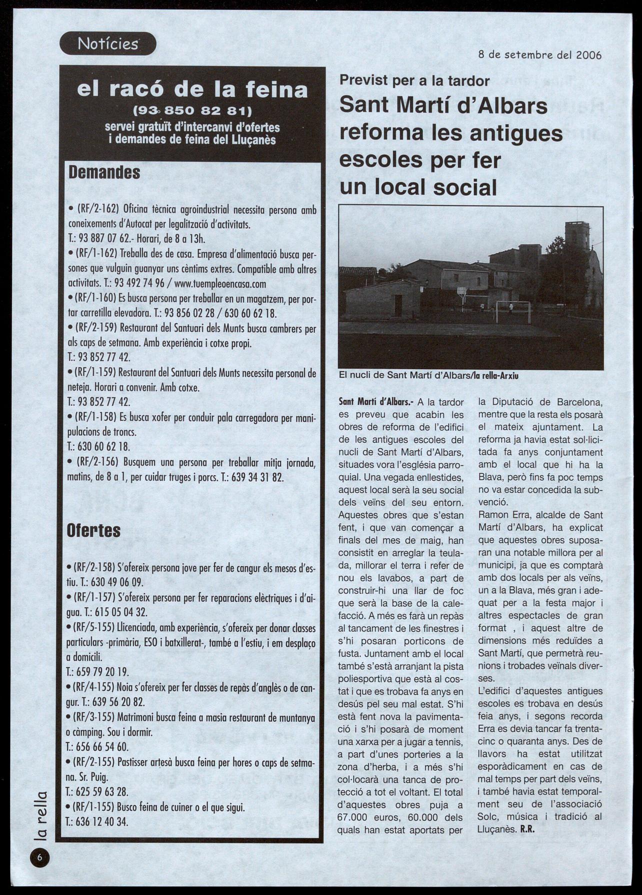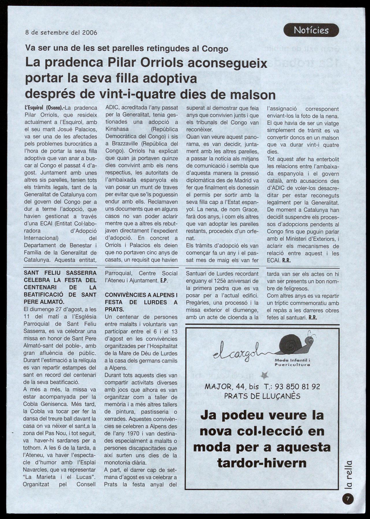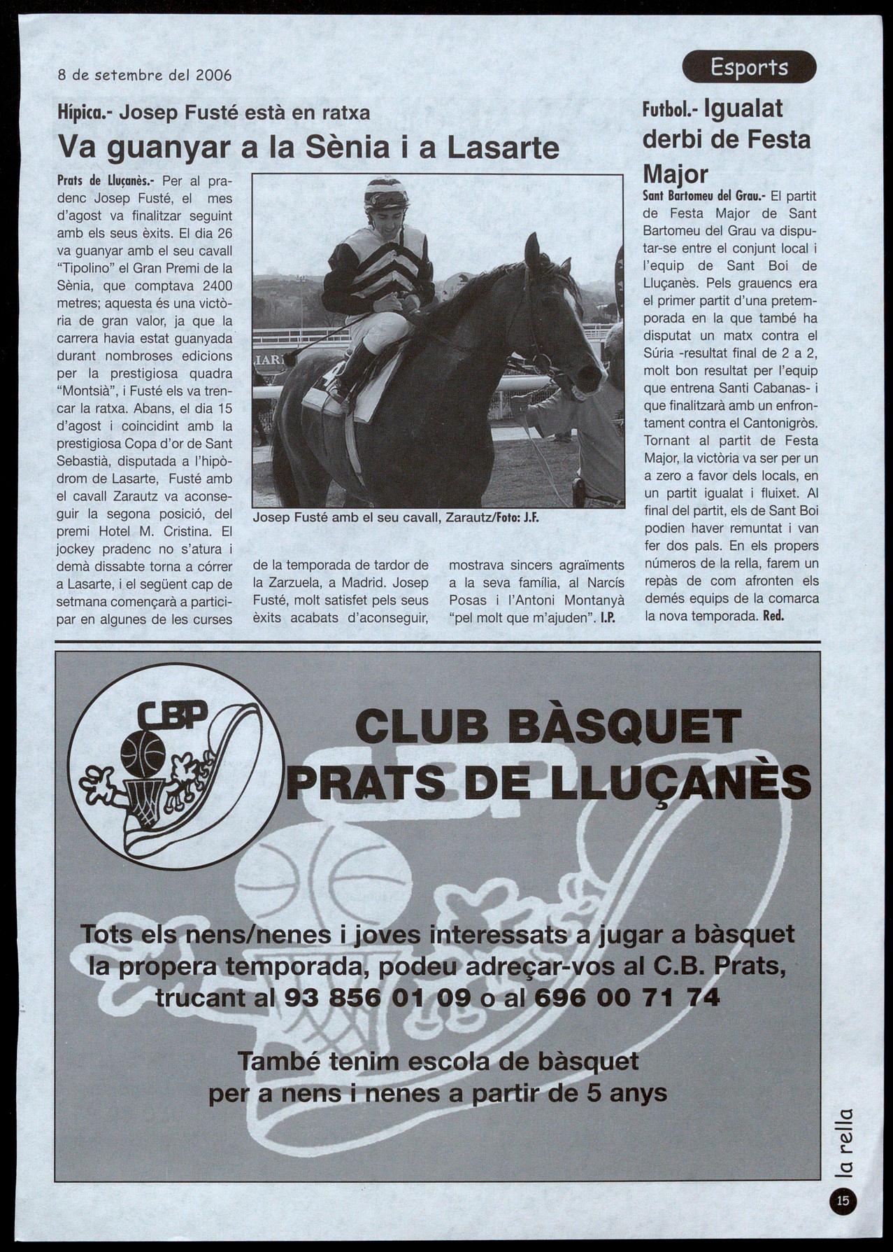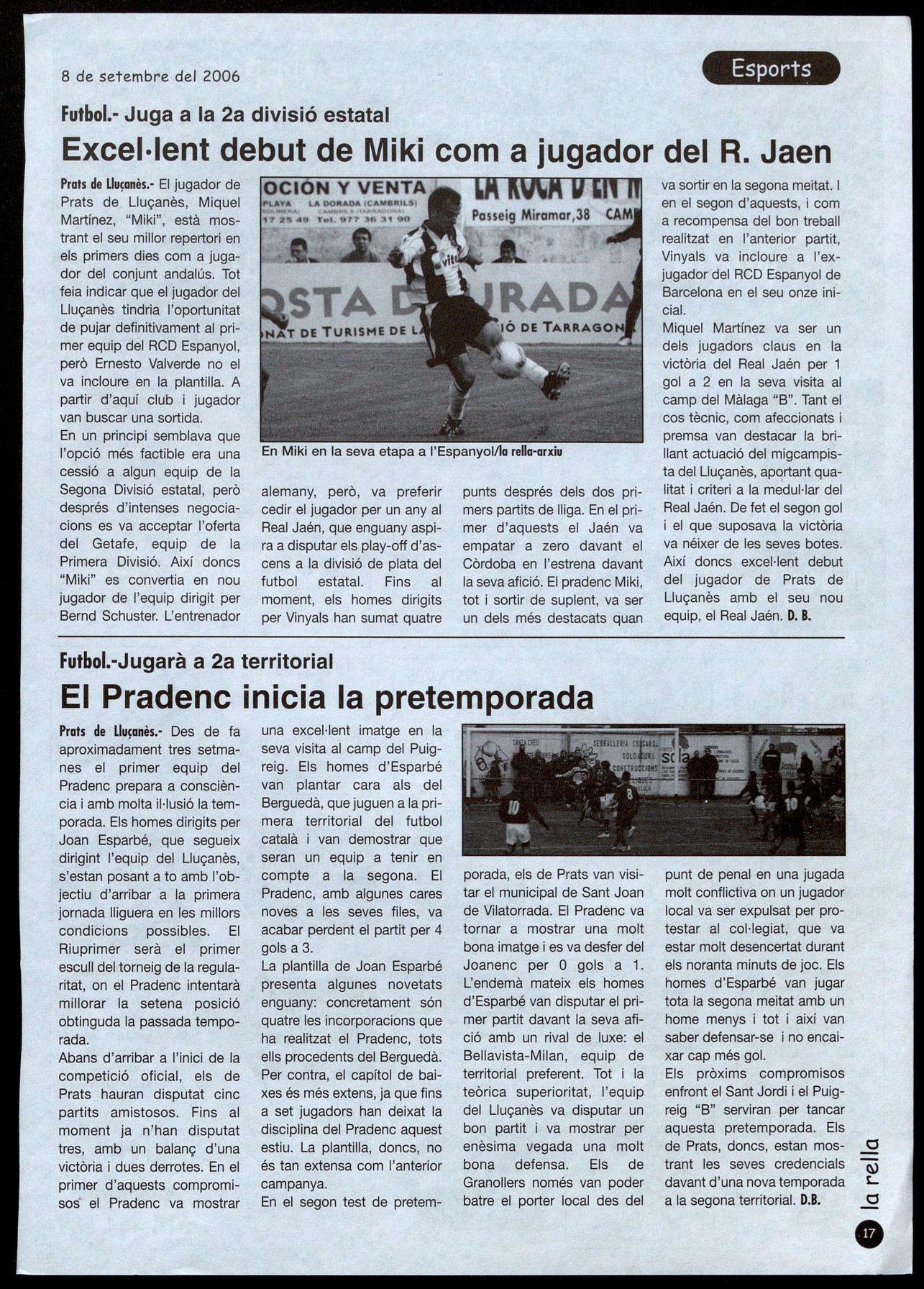 Prats de L1uçanès.- El jugador de Prats de Lluçanès, Miquel Martínez, "Miki", està mostrant el seu millor repertori en els primers dies com a jugador del conjunt andalús. Tot feia indicar que el jugador del Lluçanès tindria l'oportunitat de pujar definitivament al primer equip del ReO Espanyol, però Ernesto Valverde no el va incloure en la plantilla. A partir d'aquí club jugador van buscar una sortida. En un principi semblava que l'opció més factible era una cessió a algun equip de la Segona Divisió estatal, però després d'intenses negociacions es va acceptar l'oferta del Getafe, equip de la Primera Divisió. Així doncs "Miki" es convertia en nou jugador de l'equip dirigit per Bernd Schuster. L'entrenador