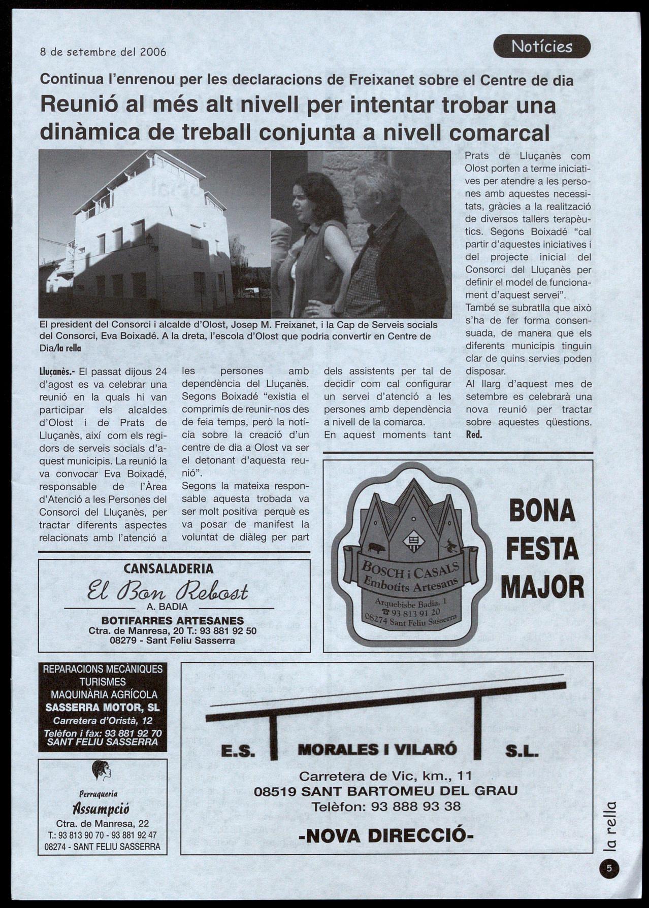 Llu�anès.- El passat dijous 24 d'agost es va celebrar una reunió en la quals hi van participar els alcaldes d'Olost i de Prats de Lluçanès, així com els regidors de serveis socials d'aquest municipis. La reunió la va convocar Eva Boixadé, responsable de l'Àrea d'Atenció a les Persones del Consorci del Lluçanès, per tractar diferents àspectes relacionats amb l'atenció a les persones amb dependència del Lluçanès. Segons Boixadé "existia el comprimís de reunir-nos des de feia temps, però la notícia sobre la creació d'un centre de dia a Olost va ser el detonant d'aquesta reunió".