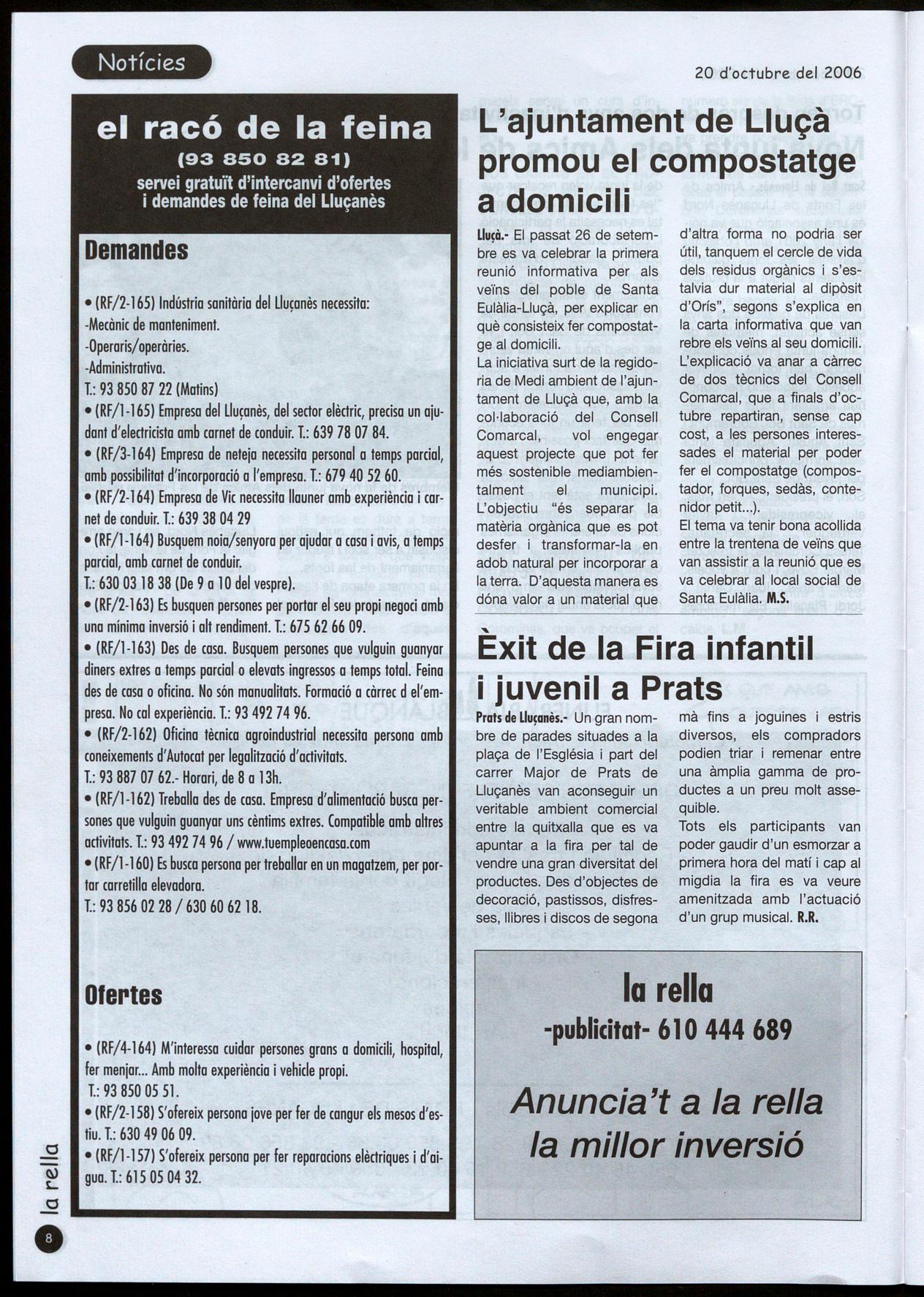 SOL·LlCITATS PER L'AJUNTAMENT DE LLUÇÀ.- Durant el mes d'octubre s'han començat els plans d'ocupació demanats per l'ajuntament de Lluçà. Els plans demanats van ser el de Dinamitzador-a cultural i turístic amb una durada de tres mesos el d'Ajudant de manteniment d'espais urbans, amb una durada de sis mesos. Aquests plans d'ocupació estan subvencionats pel Departament de Treball de la Generalitat de Catalunya. M.S.