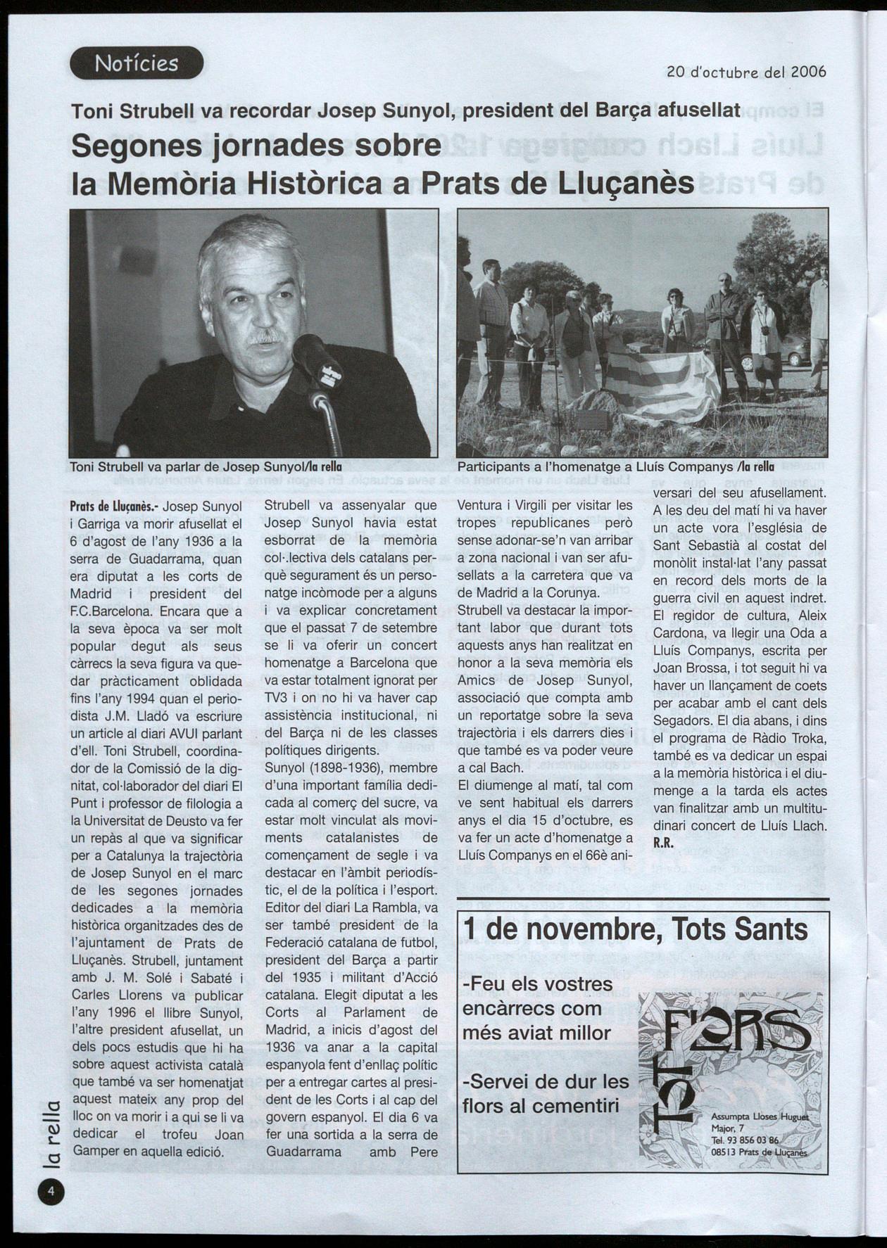 Companys /la rella versari del seu afusellament. A les deu del matí hi va haver un acte vora l'església de Sant Sebastià al costat del monòlit instal·lat l'any passat en record deis morts de la guerra civil en aquest indret. El regidor de cultura, Aleix Cardona, va llegir una Oda a Lluís Companys, escrita per Joan Brossa, i tot seguit hi va haver un llançament de coets per acabar amb el cant dels Segadors. El dia abans, dins el programa de Ràdio Troka, també es va dedicar un espai a la memòria històrica i el diumenge a la tarda els actes van finalitzar amb un multitudinari concert de Lluís Llach. R.R.
