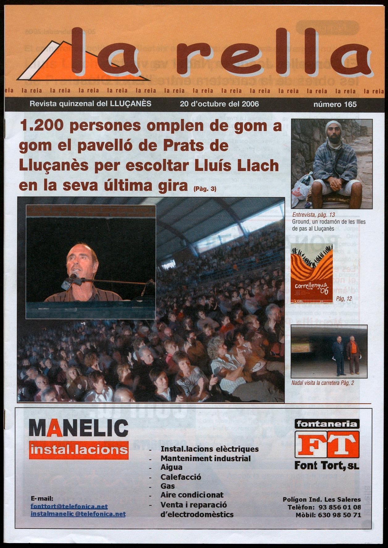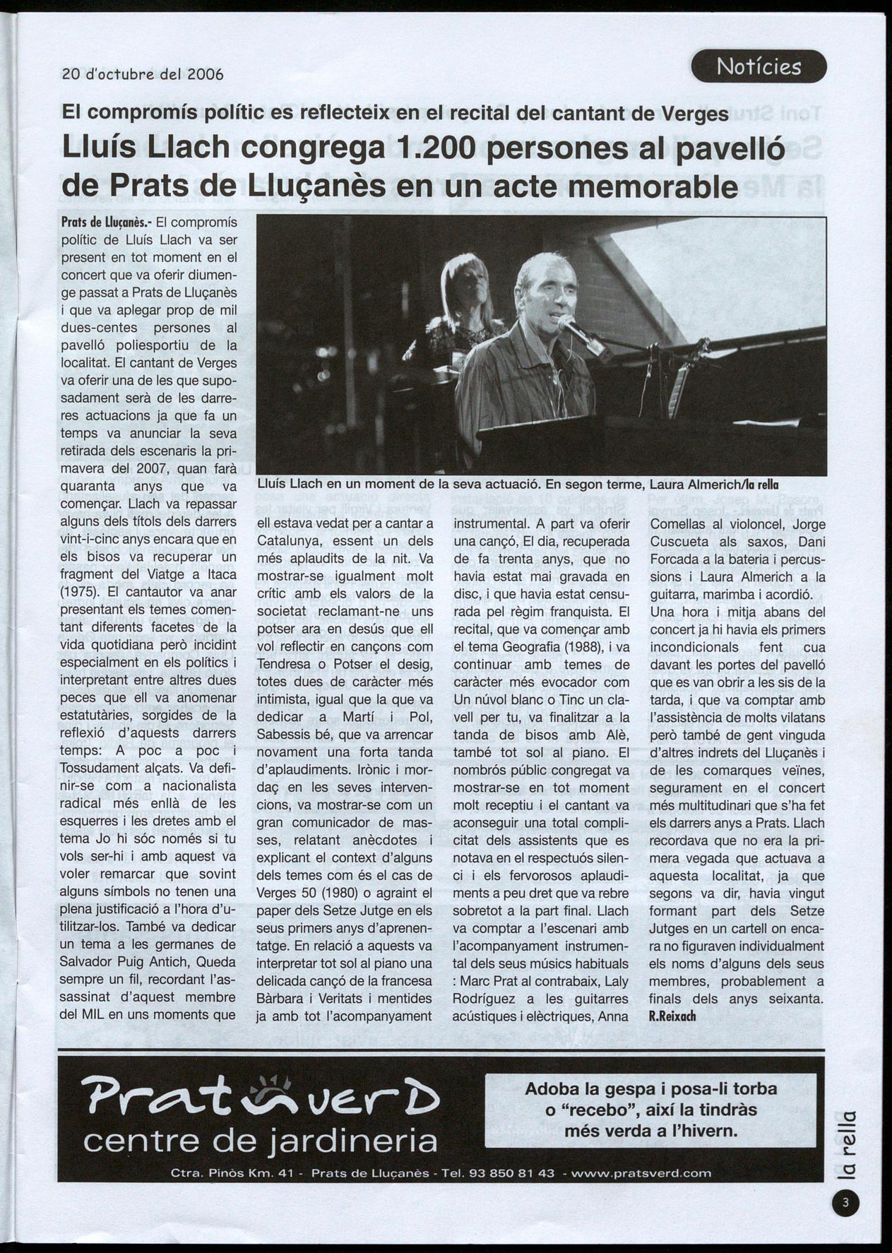 Prafs de Llu�anès.- El compromís polític de Lluís Llach va ser present en tot moment en el concert que va oferir diumenge passat a Prats de Lluçanès i que va aplegar prop de mil dues-centes persones al pavelló poliesportiu de la localitat. El cantant de Verges va oferir una de les que suposadament serà de les darreres actuacions ja que fa un temps va anunciar la seva retirada dels escenaris la primavera del 2007, quan farà quaranta anys que va començar. Llach va repassar alguns dels títols dels darrers vint-i-cinc anys encara que en els bisos va recuperar un fragment del Viatge a Itaca (1975). El cantautor va anar presentant els temes comentant diferents facetes de la vida quotidiana però incidint especialment en els polítics interpretant entre altres dues peces que ell va anomenar estatutàries, sorgides de la reflexió d'aquests darrers temps: A poc a poc Tossudament alçats. Va definir-se com a nacionalista radical més enllà de les esquerres i les dretes amb el tema Jo hi sóc només si tu vols ser-hi amb aquest va voler remarcar que sovint alguns símbols no tenen una plena justificació a l'hora d'utilitzar-los. També va dedicar un tema a les germanes de Salvador Puig Antich, Queda sempre un fil, recordant l'assassinat d'aquest membre del MIL en uns moments que