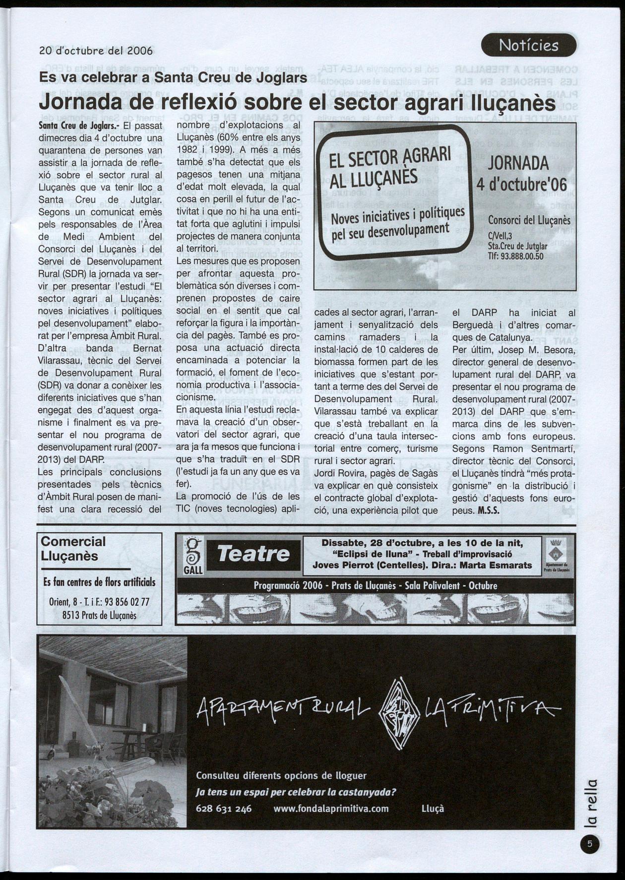 Santa Creu de Joglars.- El passat dimecres dia 4 d'octubre una quarantena de persones van assistir a la jornada de reflexió sobre el sector rural al Lluçanès que va tenir lloc a Santa Creu de Jutglar. Segons un comunicat emès pels responsables de l'Àrea de Medi Ambient del Consorci del Lluçanès i del Servei de Desenvolupament Rural (SOR) la jornada va servir per presentar l'estudi "El sector agrari al Lluçanès: noves iniciatives polítiques pel desenvolupament" elaborat per l'empresa Àmbit Rural. D'altra banda Bernat Vilarassau, tècnic del Servei de Desenvolupament Rural (SDR) va donar a conèixer les diferents iniciatives que s'han engegat des d'aquest organisme i finalment es va presentar el nou programa de desenvolupament rural (20072013) del DARP.