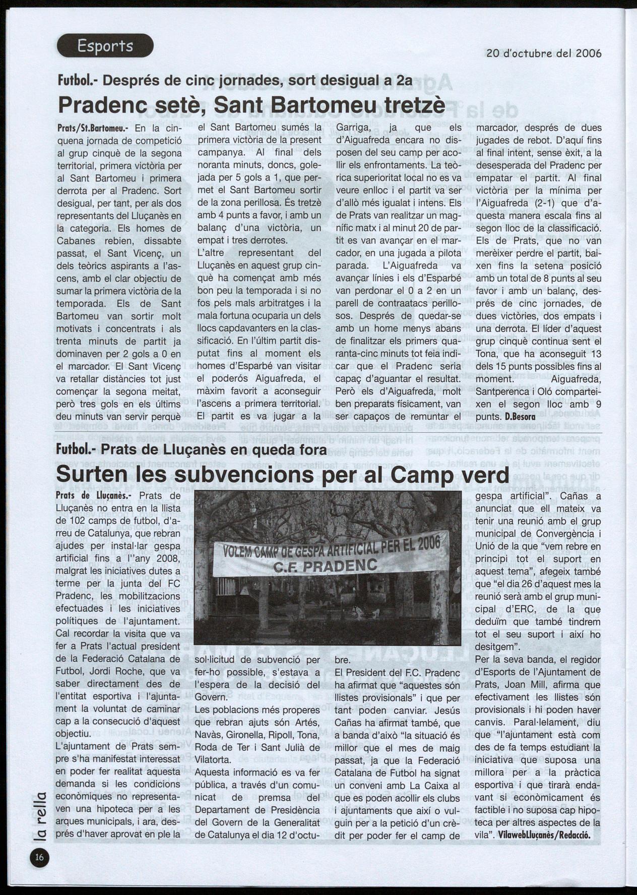 Prats de Lluçanès.- Prats de Lluçanès no entra en la llista de 102 camps de futbol, d'arreu de Catalunya, que rebran ajudes per instal·lar gespa artificial fins a I"any 2008, malgrat les iniciatives dutes a terme per la junta del' FC Pradenc, les mobilitzacions efectuades les iniciatives polítiques de l'ajuntament. Cal recordar la visita que va fer a Prats l'actual president de la Federació Catalana de Futbol, Jordi Roche, que va saber directament des de l'entitat esportiva i l'ajuntament la voluntat de caminar cap a la consecució d'aquest objectiu.