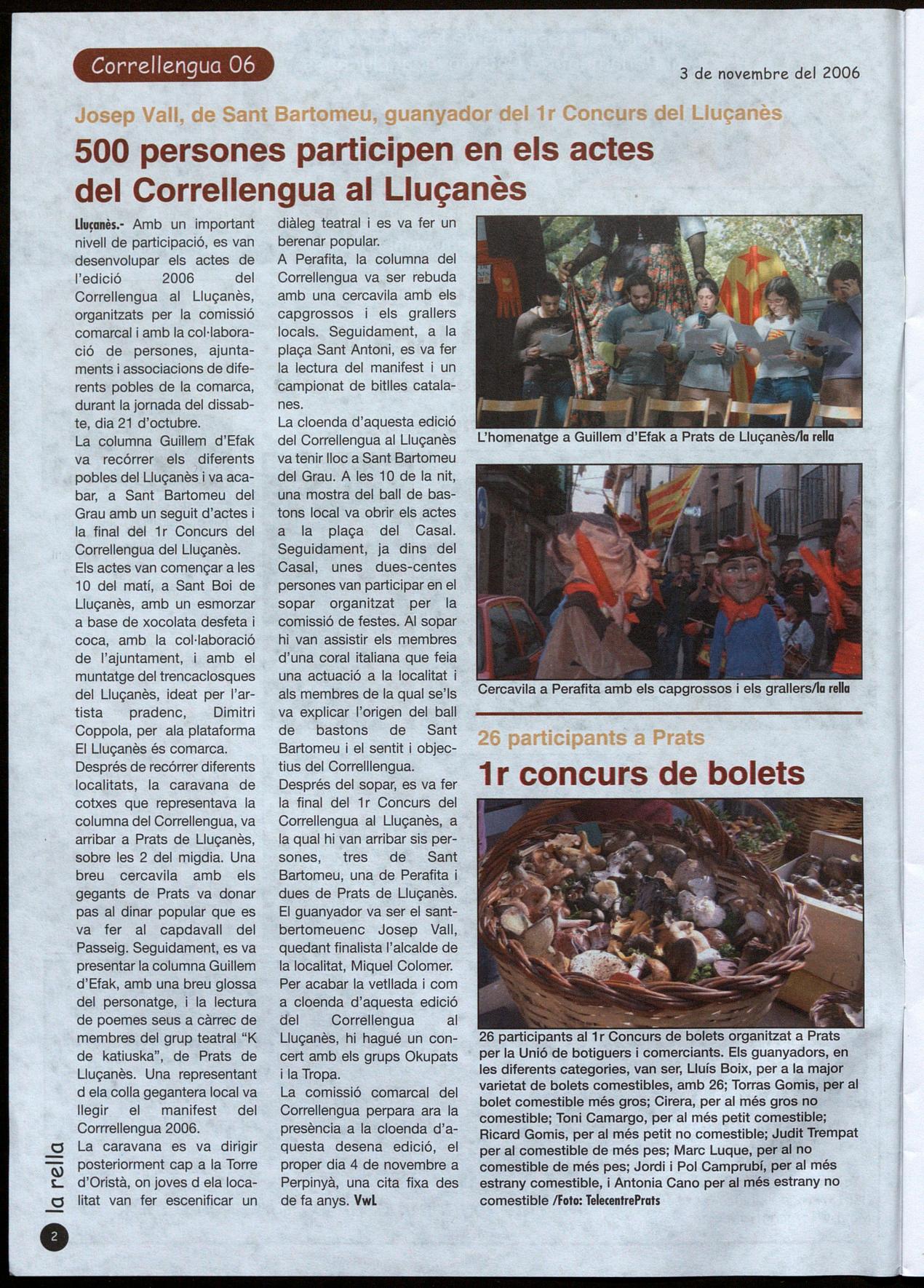 500 persones participen al Correllengua 2006 al Lluçanès Josep Vall, de Sant Bartomeu del Grau, guanyador del 1 r concurs del Correllengua (Pàg. 2)