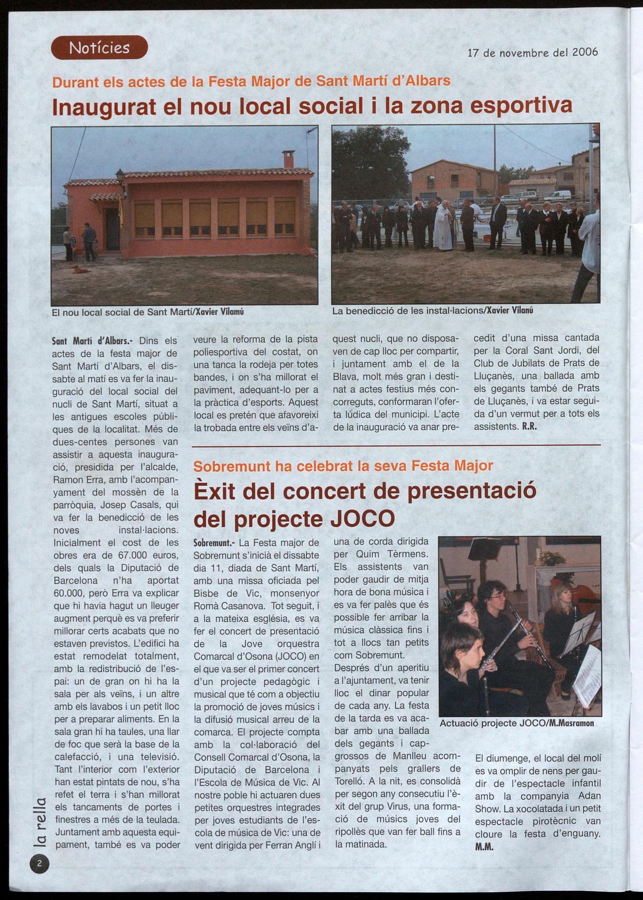 Sobremunt.- La Festa major de Sobremunt s'inicià el dissabte dia 11, diada de Sant Martí, amb una missa oficiada pel Bisbe de Vic, monsenyor Romà Casanova. Tot seguit, i a la mateixa església, es va fer el concert de presentació de la Jove orquestra Comarcal d'Osona (JOCO) en el que va ser el primer concert d'un projecte pedagògic musical que té com a objectiu la promoció de joves músics i la difusió musical arreu de la comarca. El projecte compta amb la col-laboració del Consell Comarcal d'Osona, la Diputació de Barcelona l'Escola de Música de Vic. AI nostre poble hi actuaren dues petites orquestres integrades per joves estudiants de l'escola de música de Vic: una de vent dirigida per Ferran Anglí
