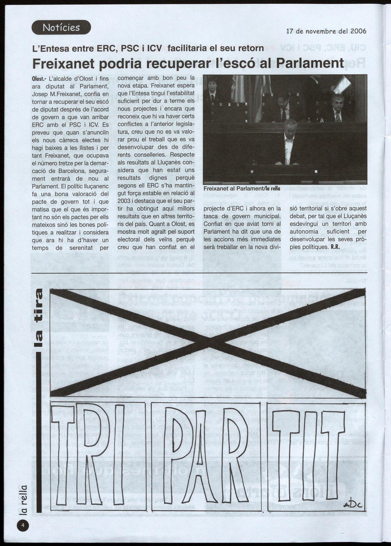 Olost.- L'alcalde d'Olost fins ara diputat al Parlament, Josep M.Freixanet, confia en tornar a recuperar el seu escó de diputat després de I'acdrd de govern a que van arribar ERC amb el PSC i ICV. Es preveu que quan s'anunciïn els nous càrrecs electes hi hagi baixes a les llistes i per tant Freixanet, que ocupava el número tretze per la demarcació de Barcelona, segurament entrarà de nou al Parlament. El polític lIuçanenc fa una bona valoració del pacte de govern tot i que matisa que el que és important no són els pactes per ells mateixos sinó les bones polítiques a realitzar considera que ara hi ha d'haver un temps de serenitat per